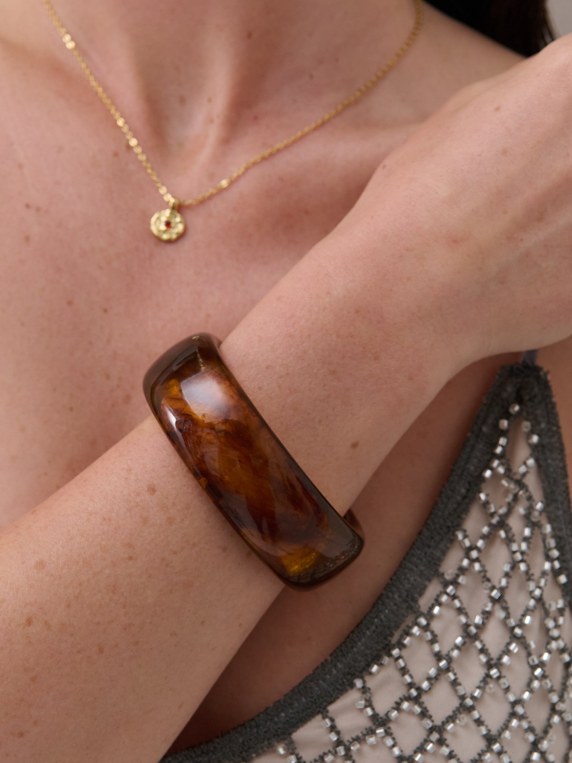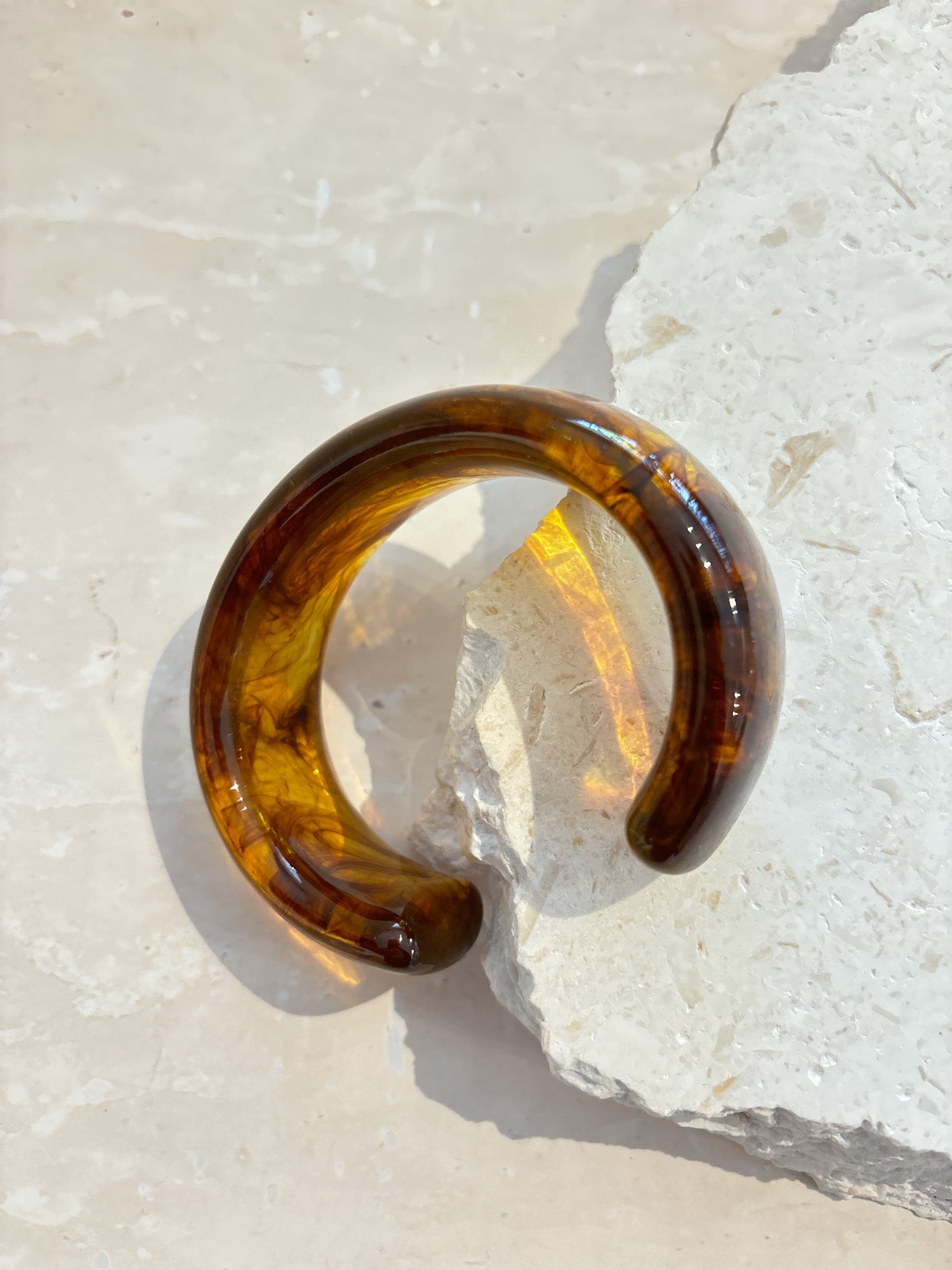 Add a chic touch to any outfit with our Joey Open Cuff Bangle in Brown. With their lightweight feel, they are comfortable to wear all day long. A must-have accessory for any fashion lover.