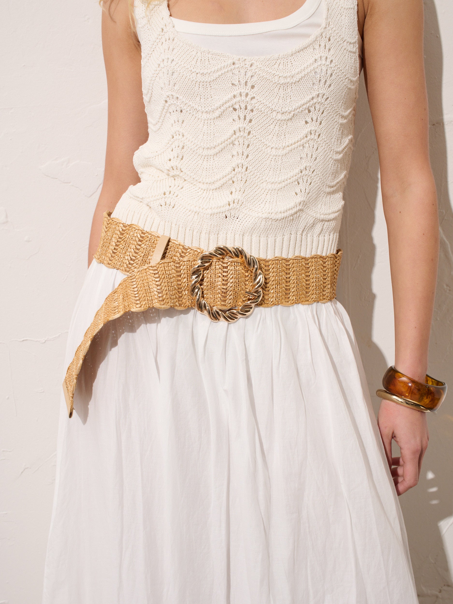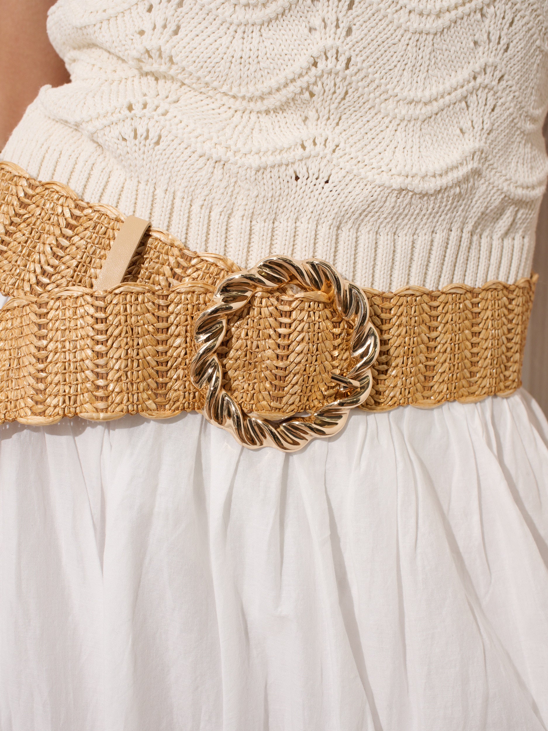 Complete your look with the Carmen Straw Metal Buckle Belt – crafted with a straw woven texture and stretchy elastic waistband for comfort. Its elegant design will seamlessly take you from weekday to weekend style.