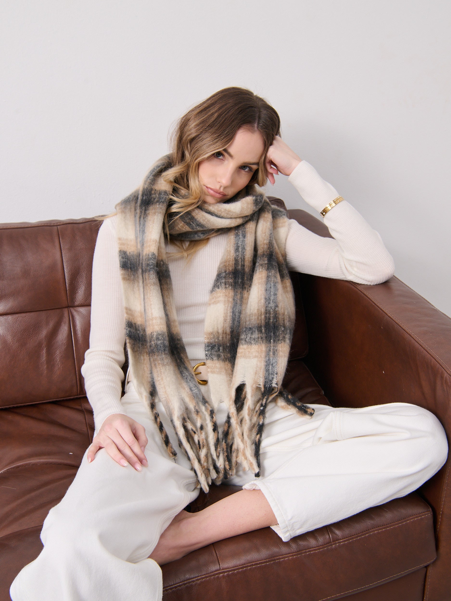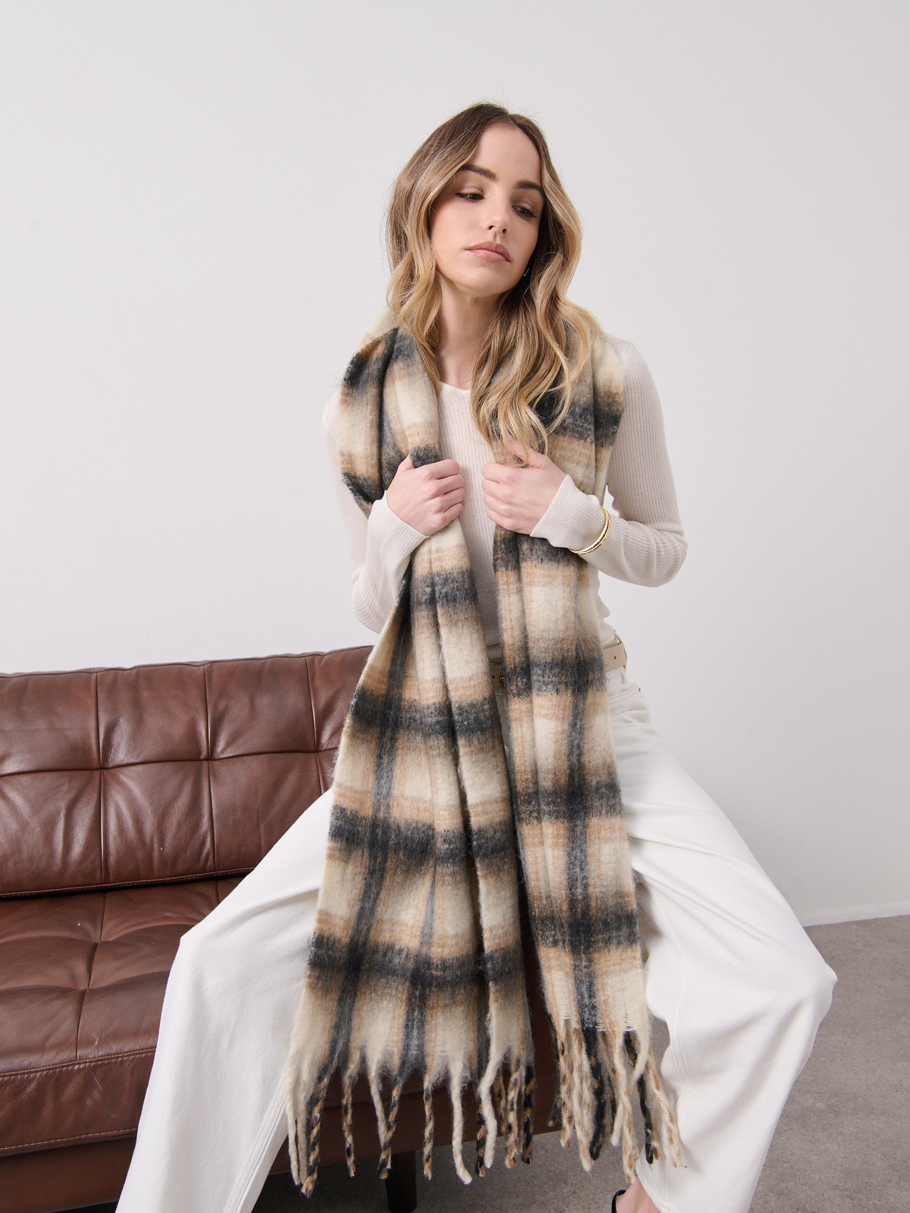 Elena Checkered Fluffy Scarf in White