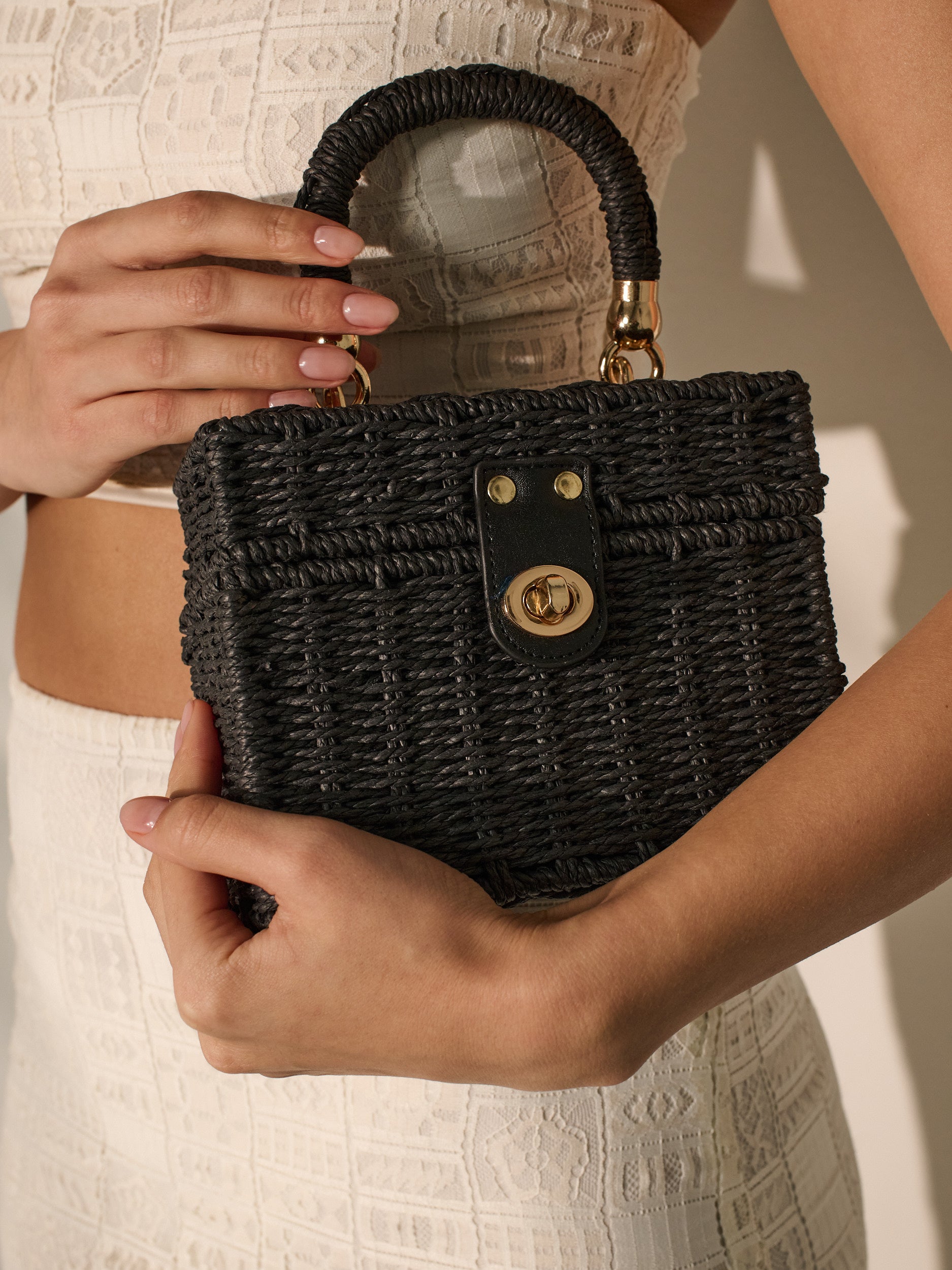 Features chic box style hand bag, with woven raffia and sturdy handle.