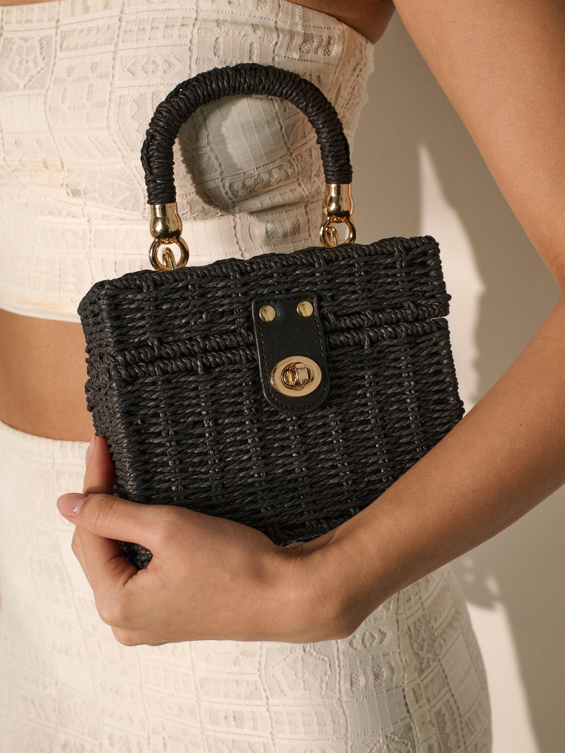 Fawn Rattan Box Crossbody Bag in Black