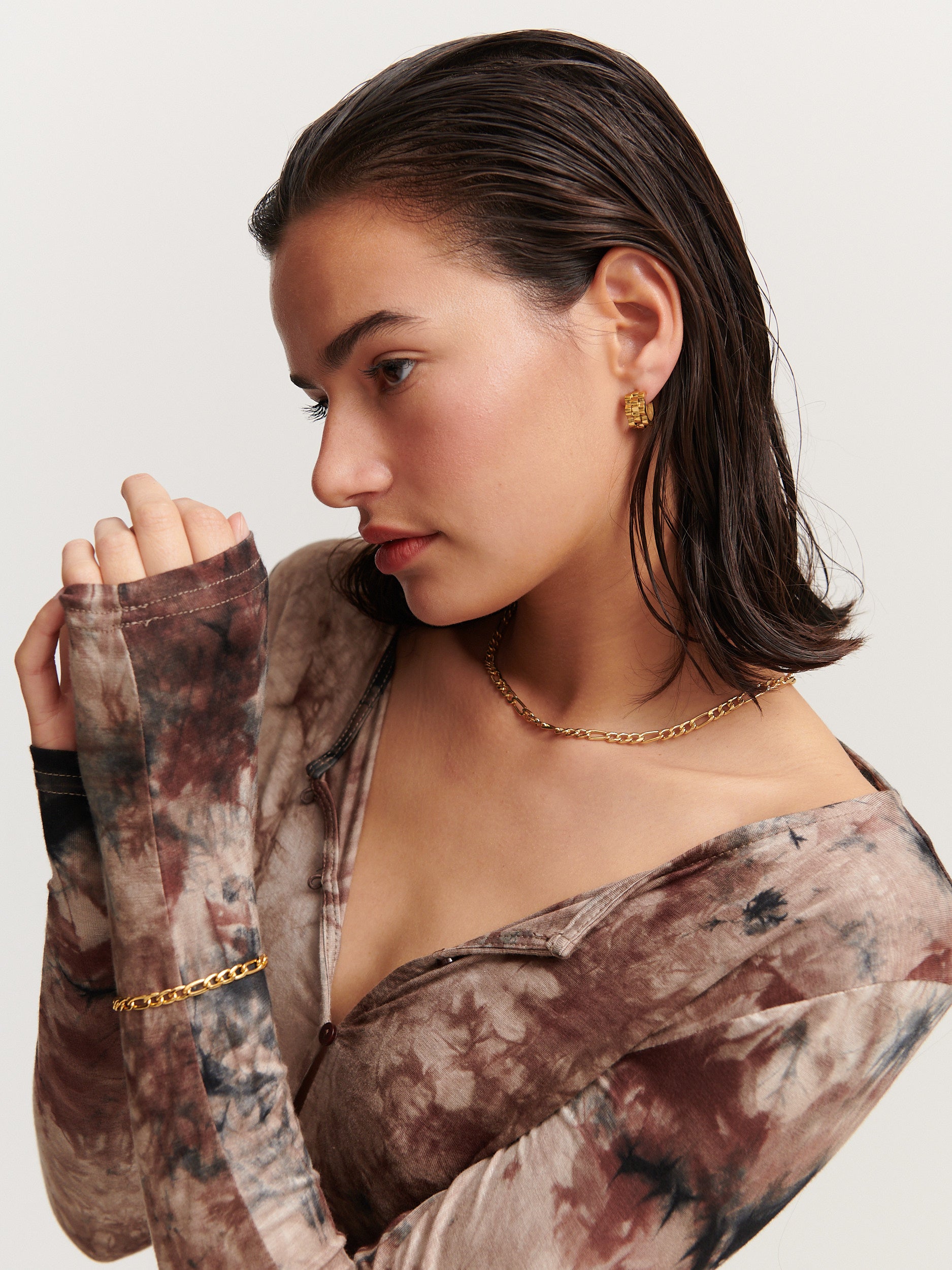 - 18K gold plating on brass base metal, topped with protective anti-tarnish layer