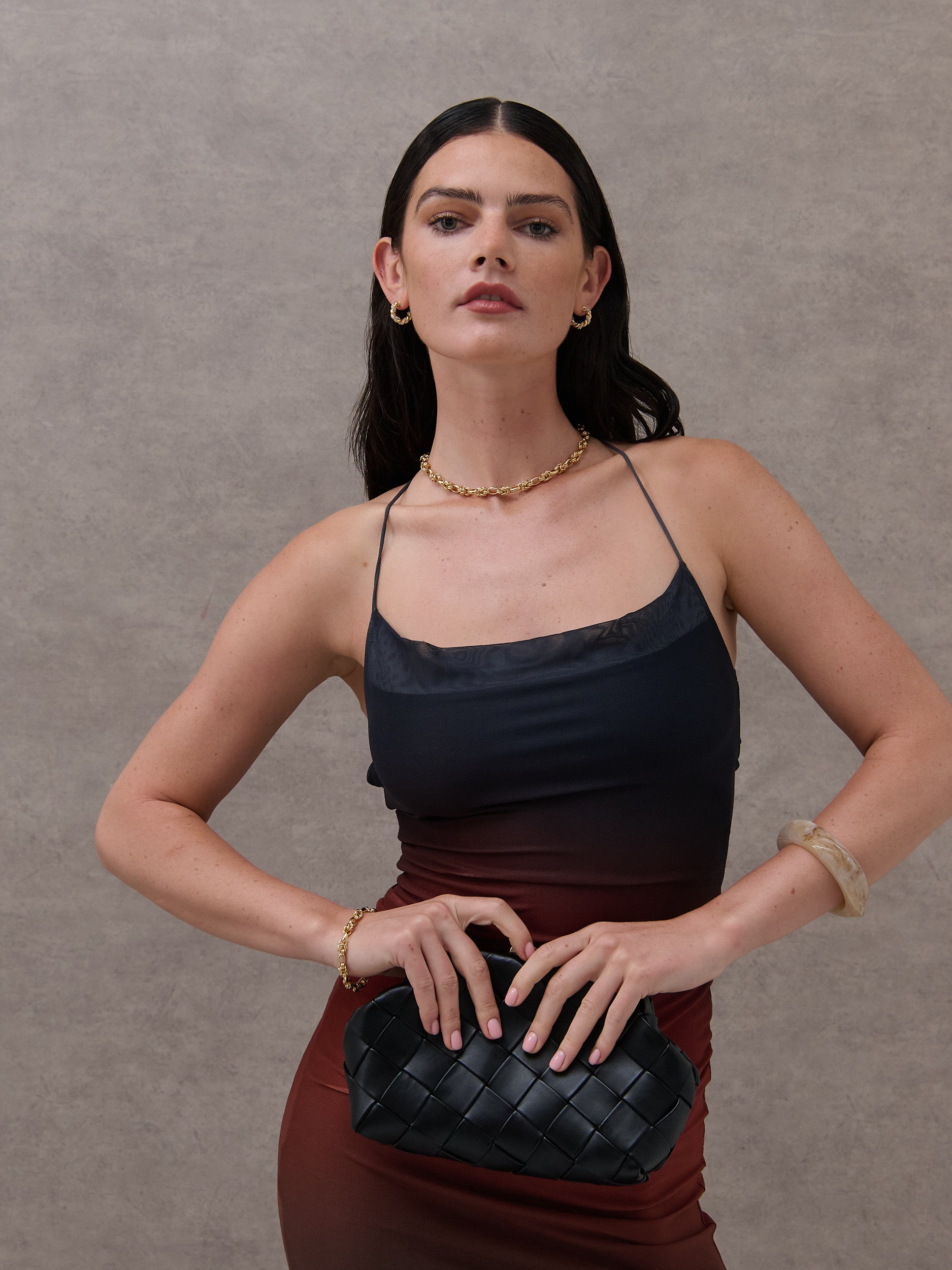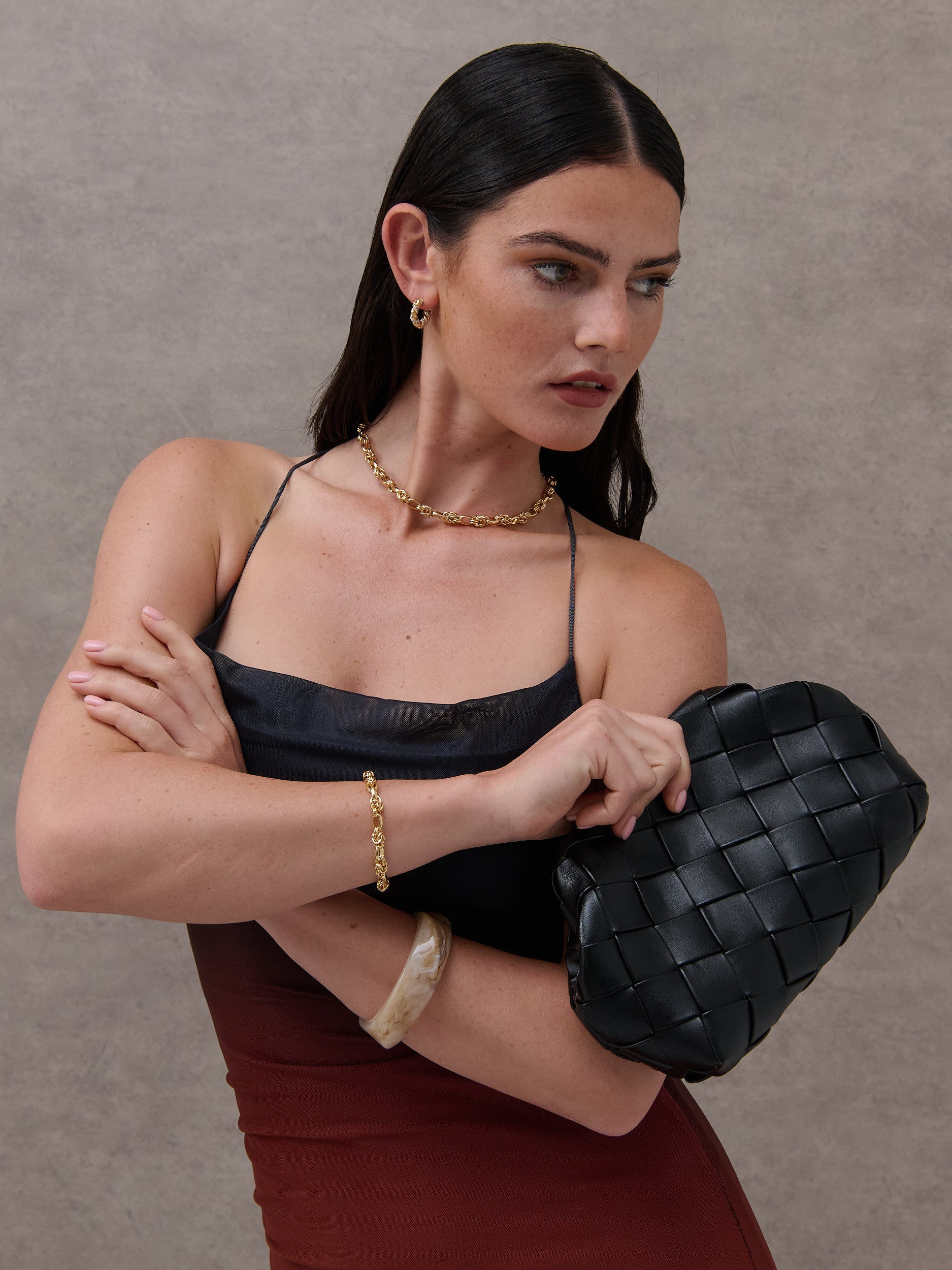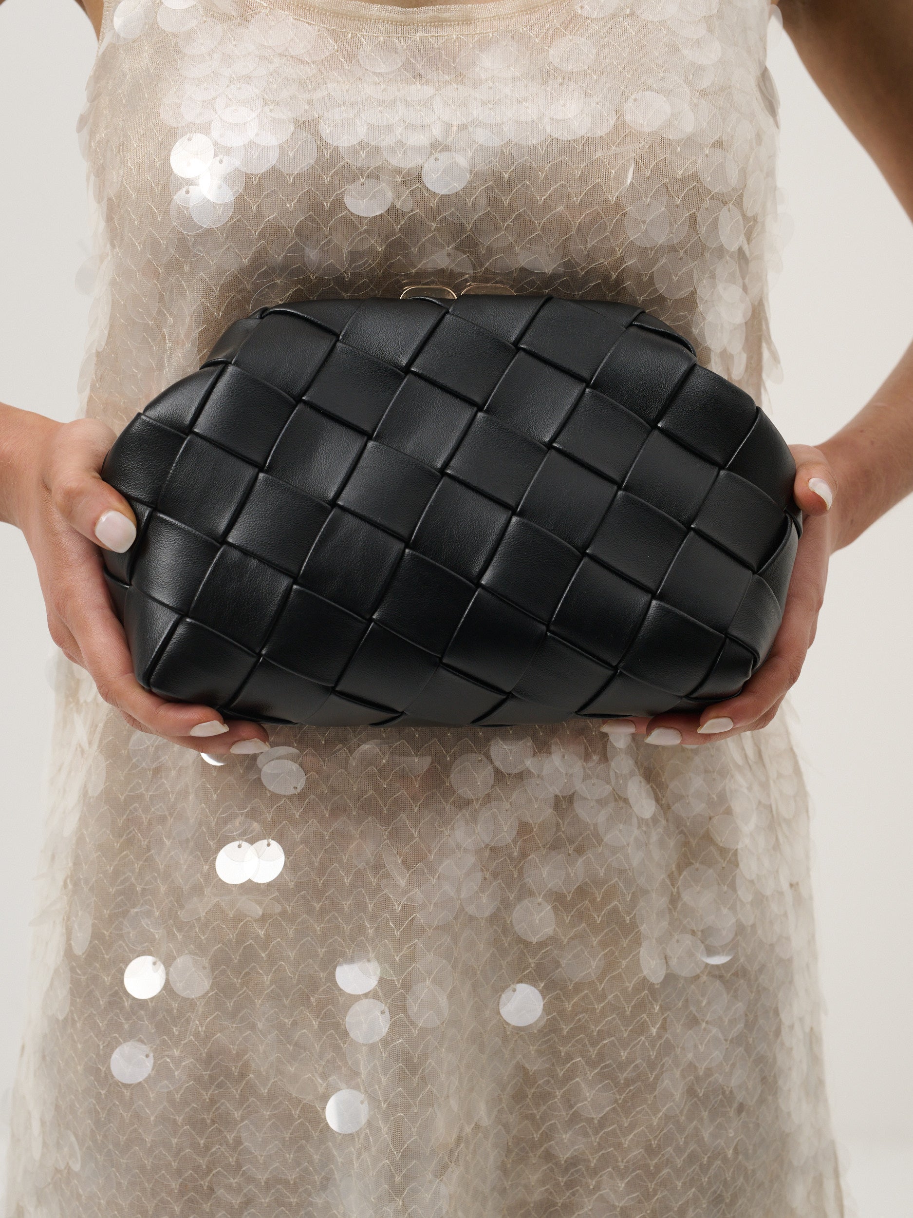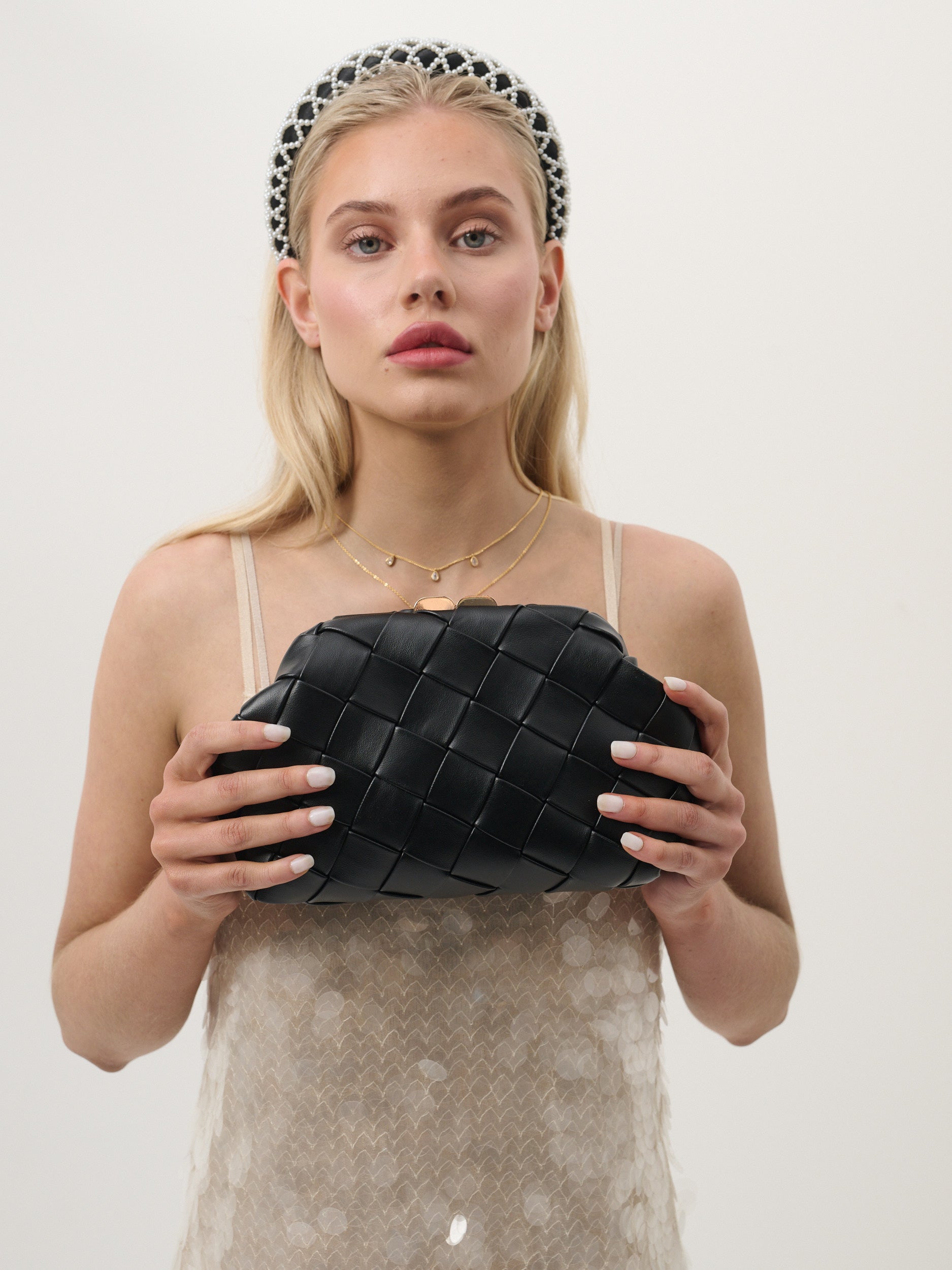 Indulge in the luxurious style of the Gianna Woven Clutch Bag. Expertly crafted with intricate weaving, this bag exudes sophistication and elegance. With its spacious interior and versatile design, it effortlessly combines fashion and function. Elevate any outfit with this exclusive accessory. Features removable metal chain shoulder strap, snap clasp closure and 1 internal zipped compartment.