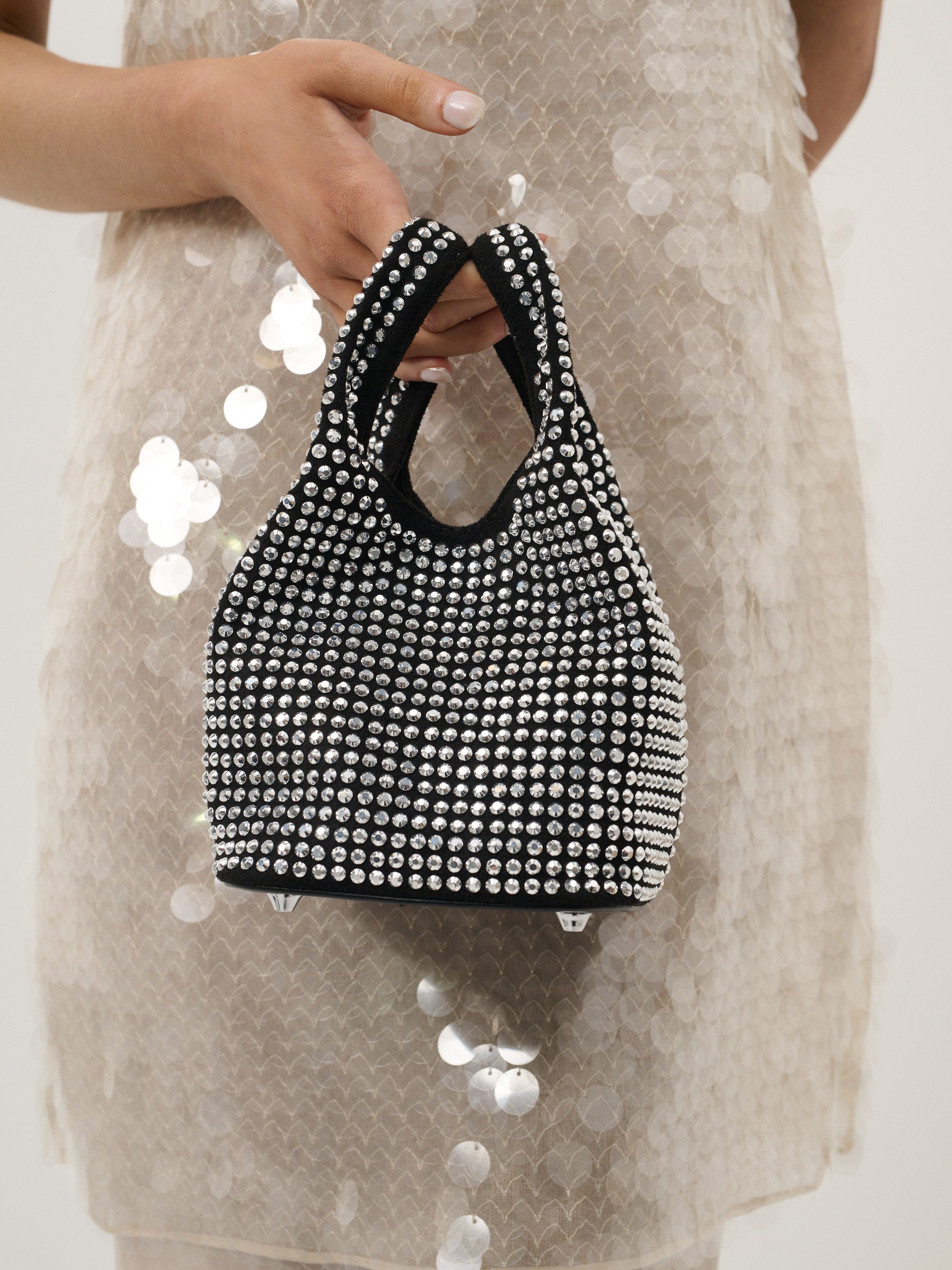 Features all-over rhinestone crystals, magnetic button closure, 1 internal pocket slot and metal feet to protect bag base.