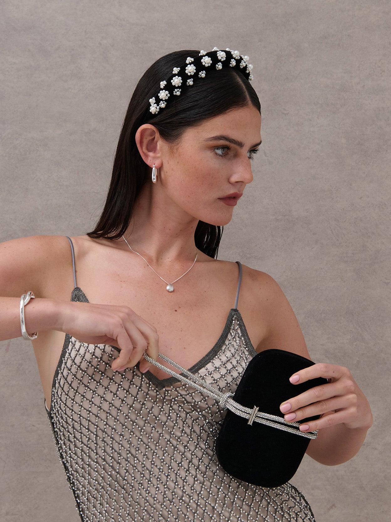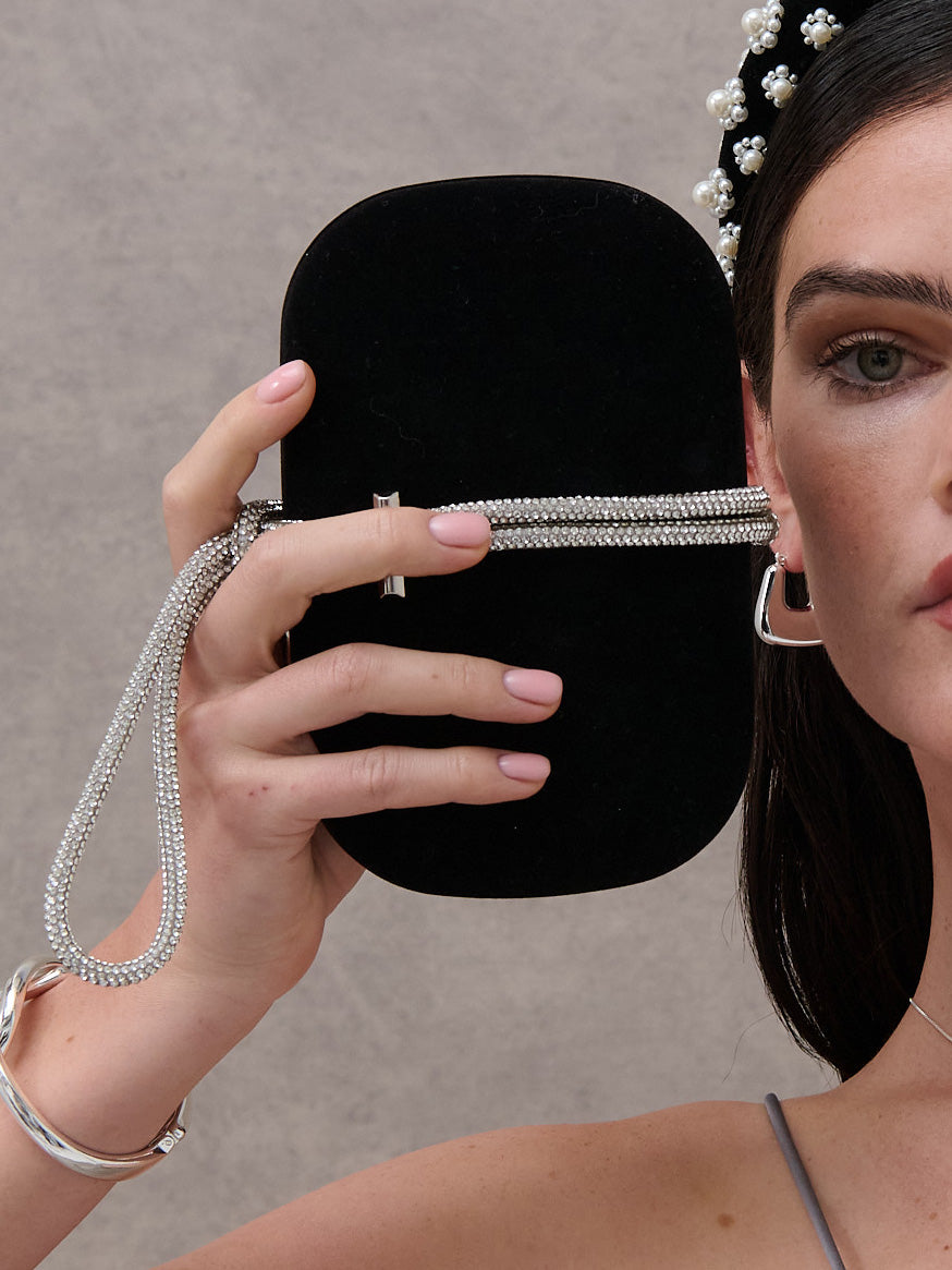 Exude elegance and sophistication with our Martini Rhinestone Strap Clutch in Black. This exquisite clutch features luxurious velvet outshell with rhinestone wristlet strap, perfect for any special occasion. Elevate your style and add a touch of grace to your outfit with this timeless accessory.