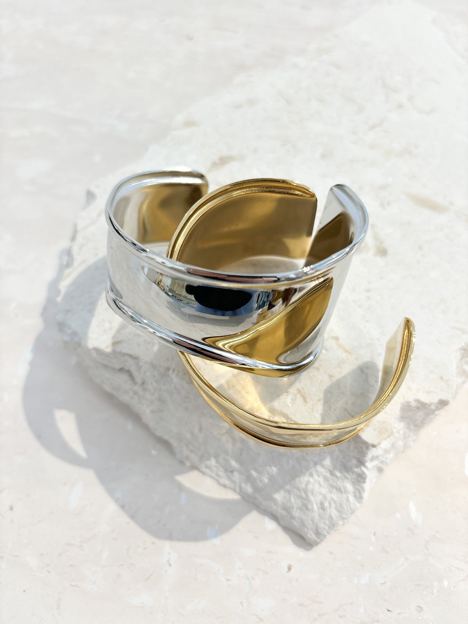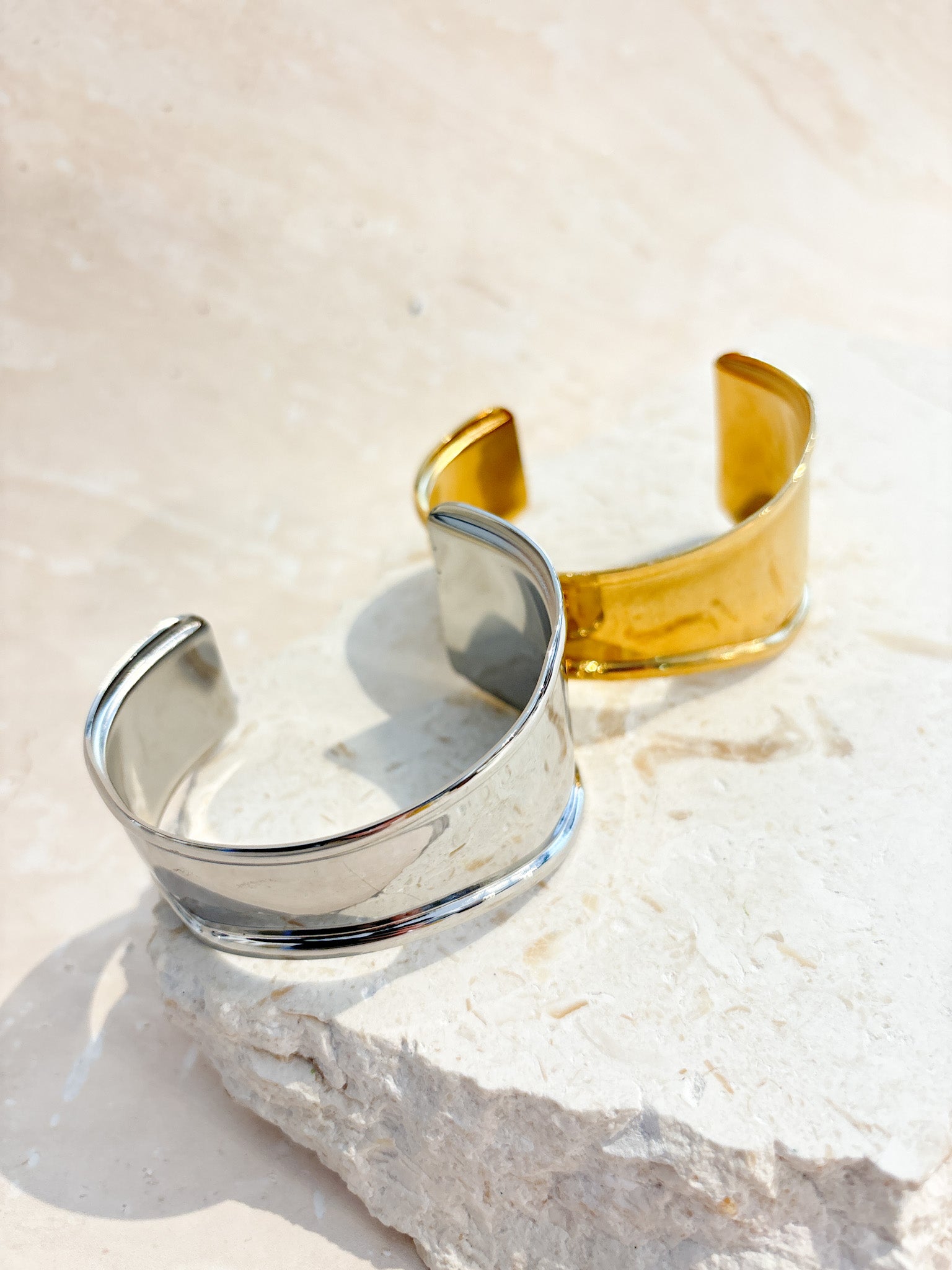 Add a chic touch to any outfit with our Metal Cuff Bangle in Gold. With their lightweight feel, they are comfortable to wear all day long. A must-have accessory for any fashion lover.