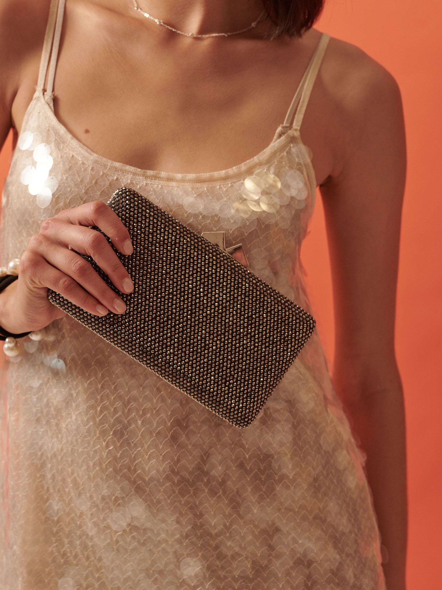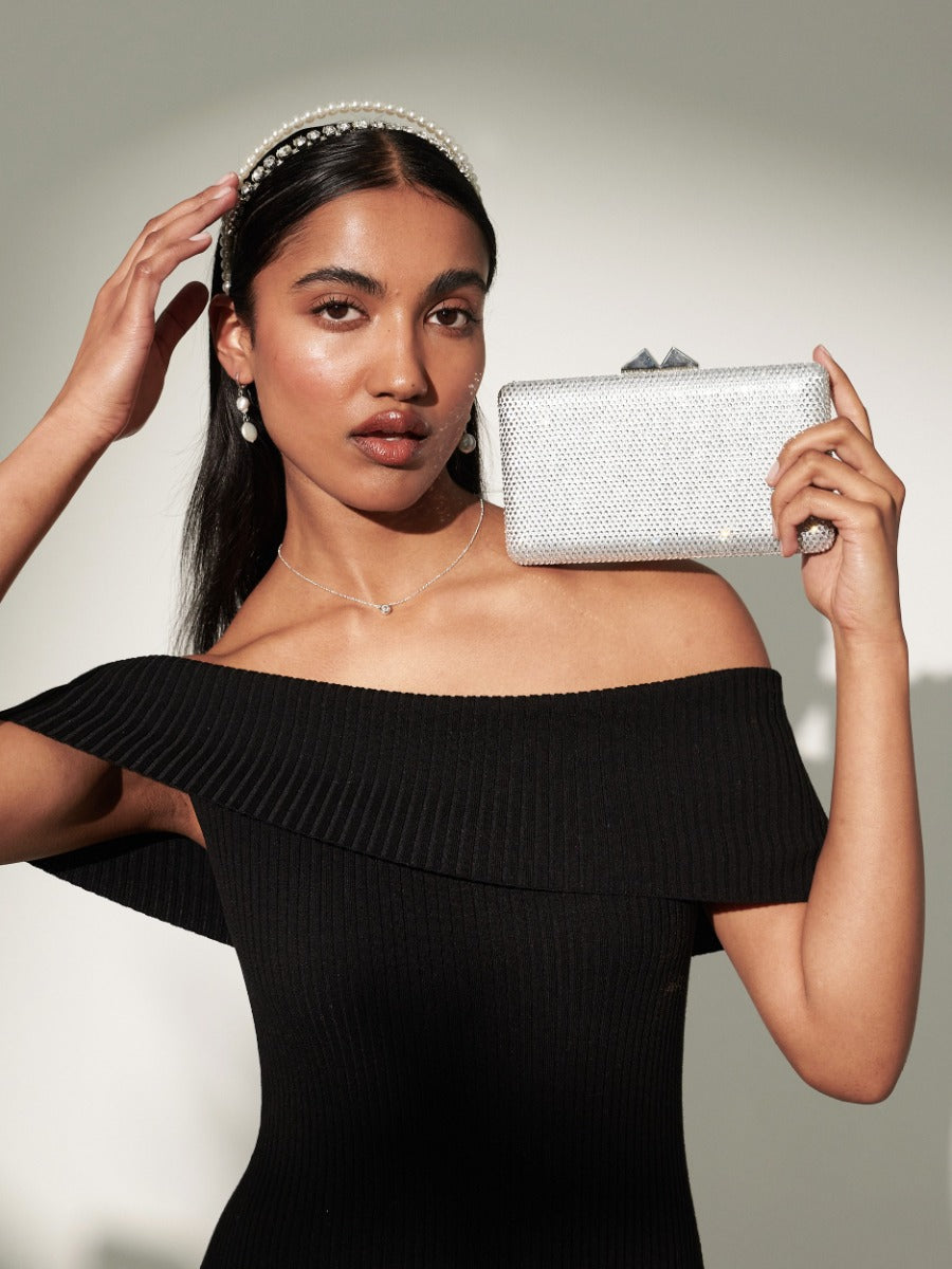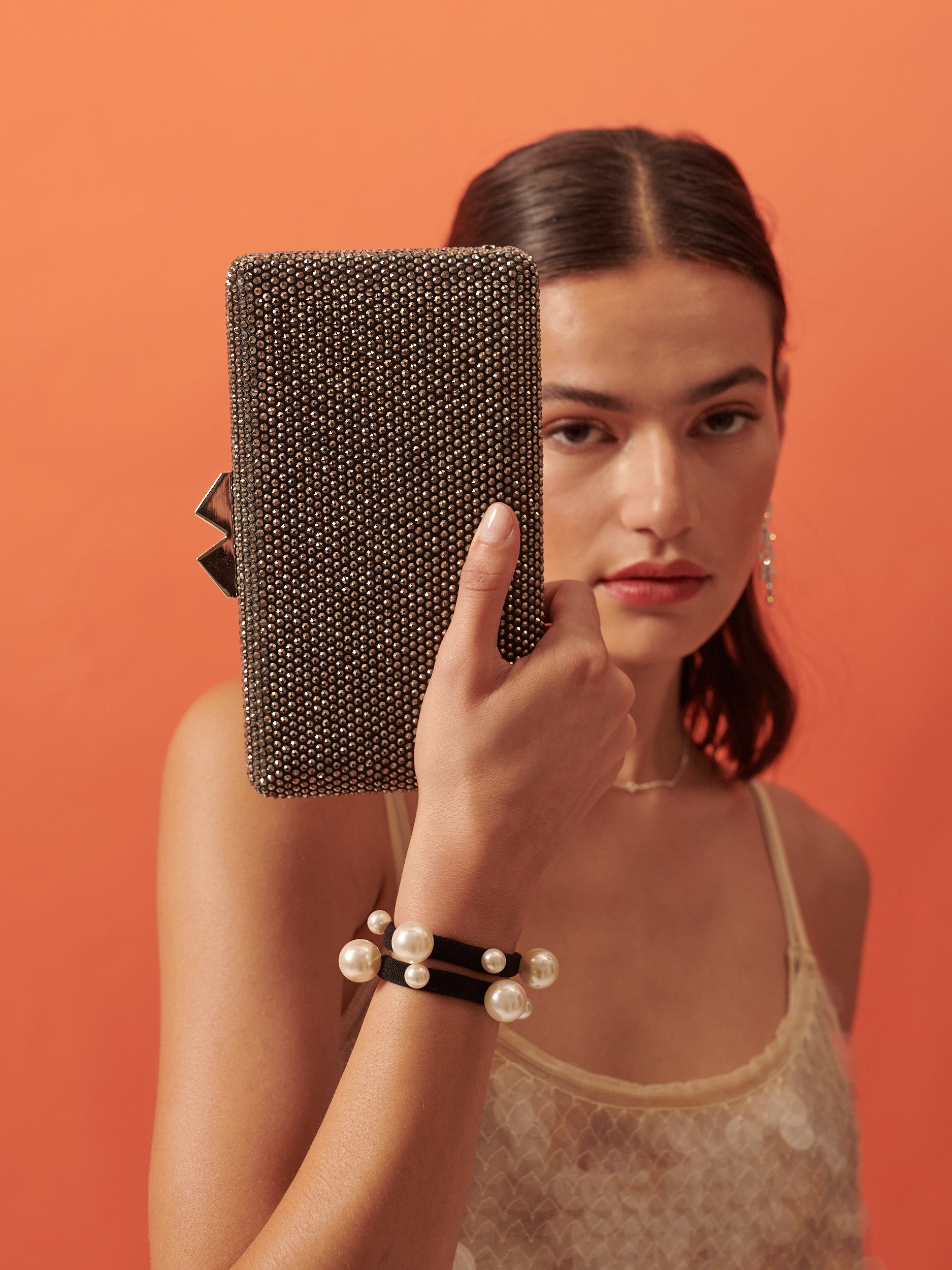 Features rounded box shape with lock closure, with removable shoulder chain strap.