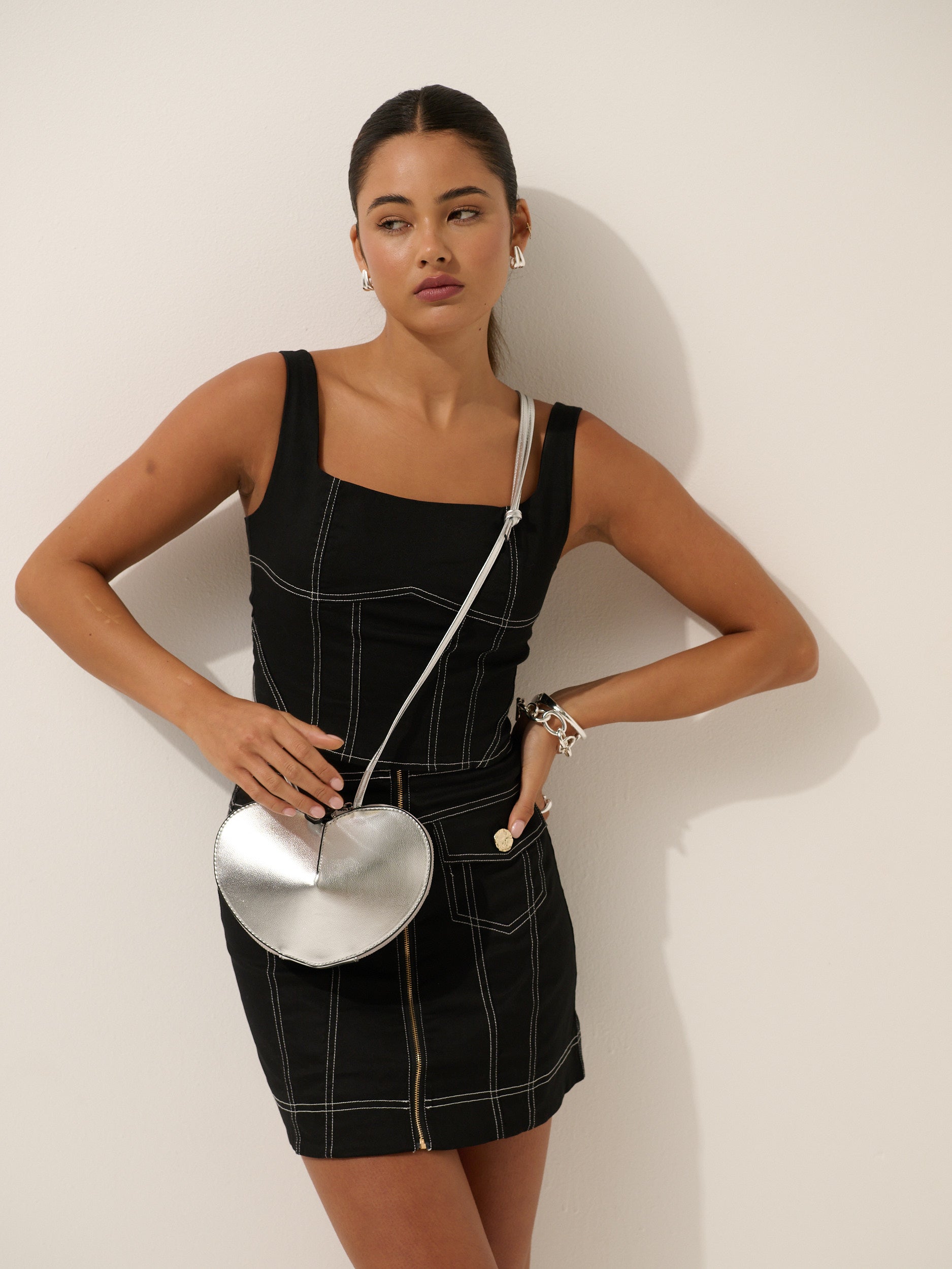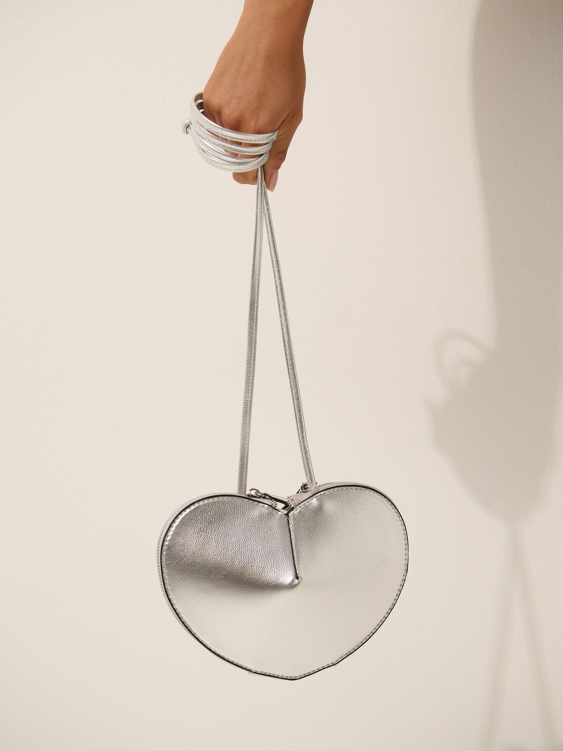 Features heart shaped bag, with adjustable strap for shoulder & crossbody.