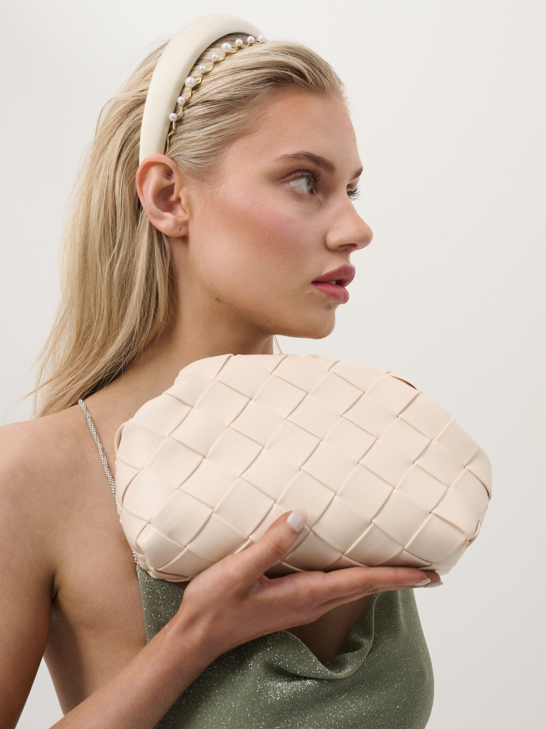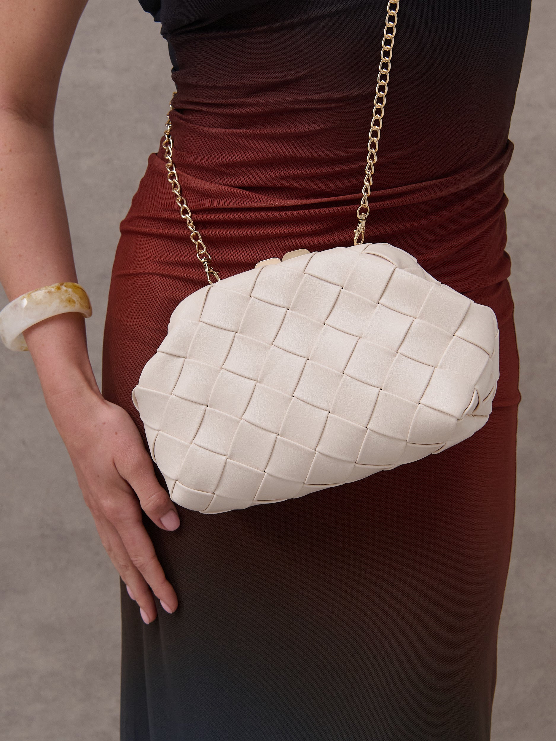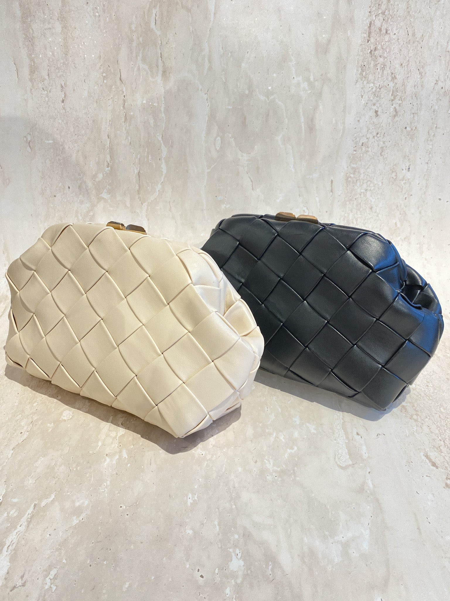 Indulge in the luxurious style of the Gianna Woven Clutch Bag. Expertly crafted with intricate weaving, this bag exudes sophistication and elegance. With its spacious interior and versatile design, it effortlessly combines fashion and function. Elevate any outfit with this exclusive accessory. Features removable metal chain shoulder strap, snap clasp closure and 1 internal zipped compartment.