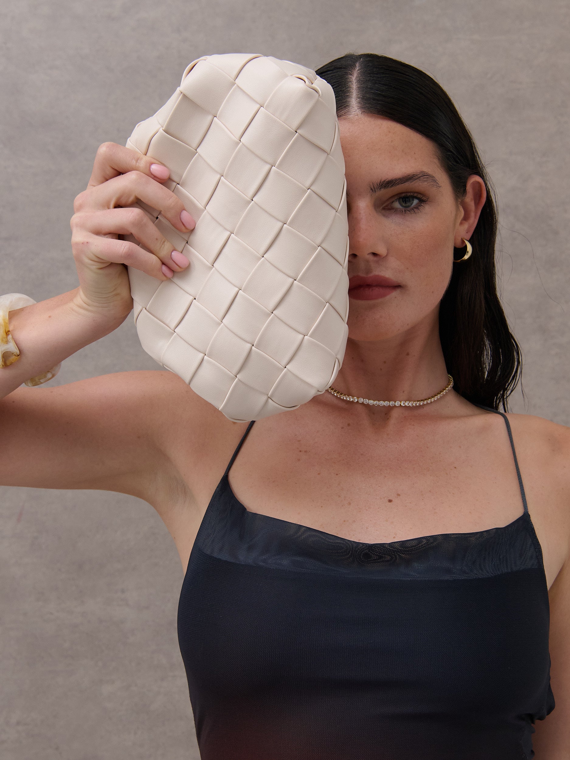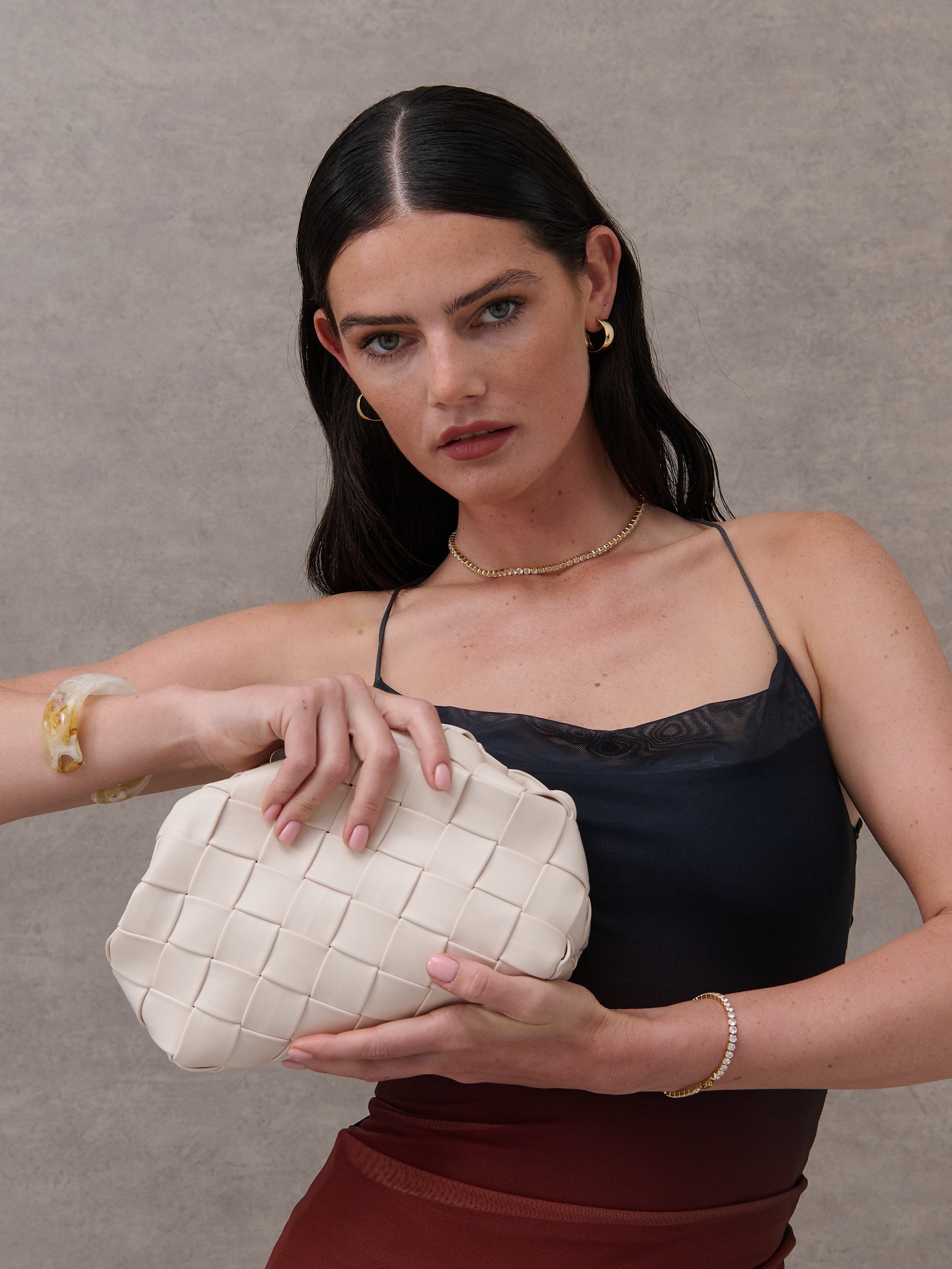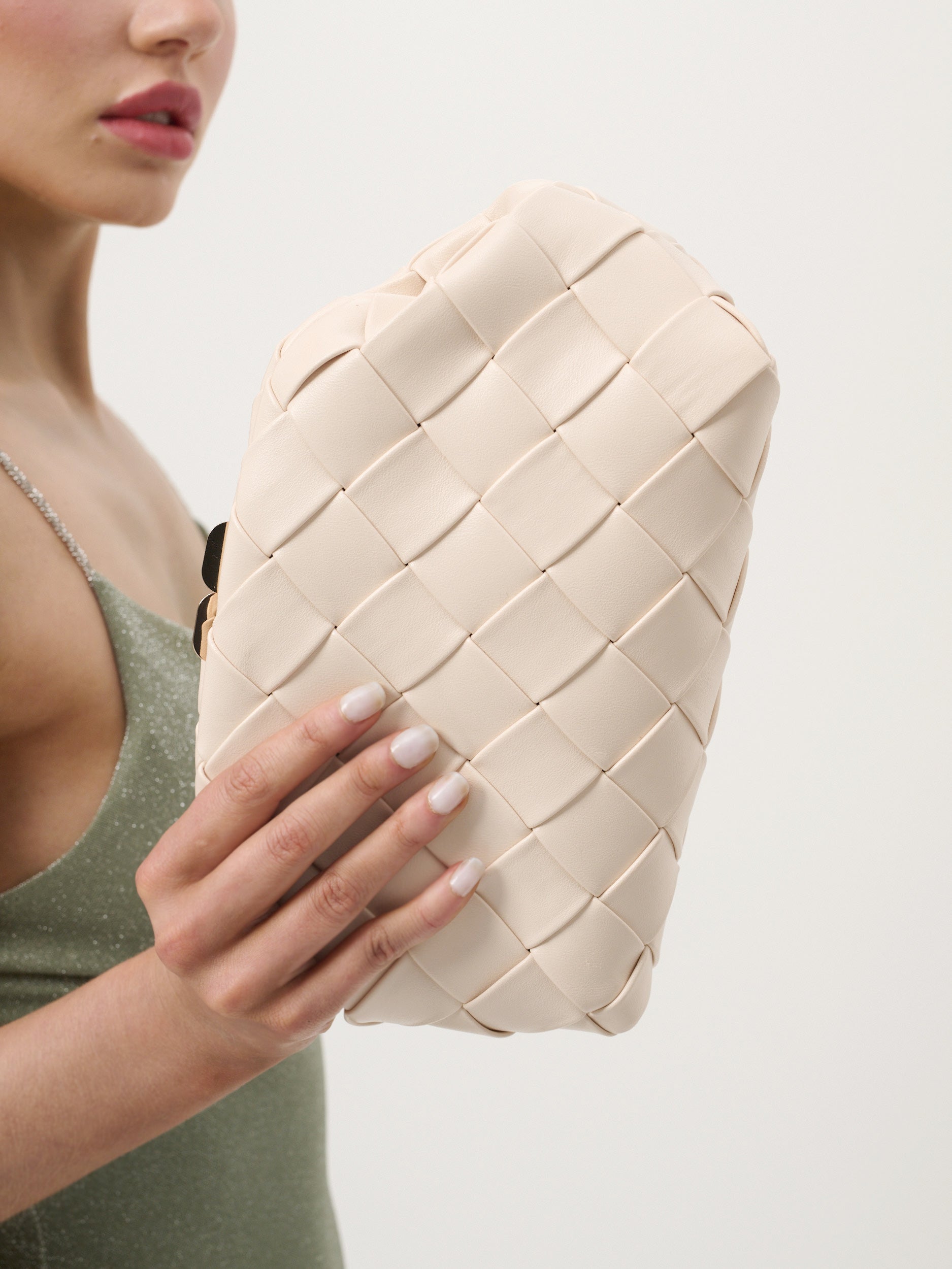 Indulge in the luxurious style of the Gianna Woven Clutch Bag. Expertly crafted with intricate weaving, this bag exudes sophistication and elegance. With its spacious interior and versatile design, it effortlessly combines fashion and function. Elevate any outfit with this exclusive accessory. Features removable metal chain shoulder strap, snap clasp closure and 1 internal zipped compartment.