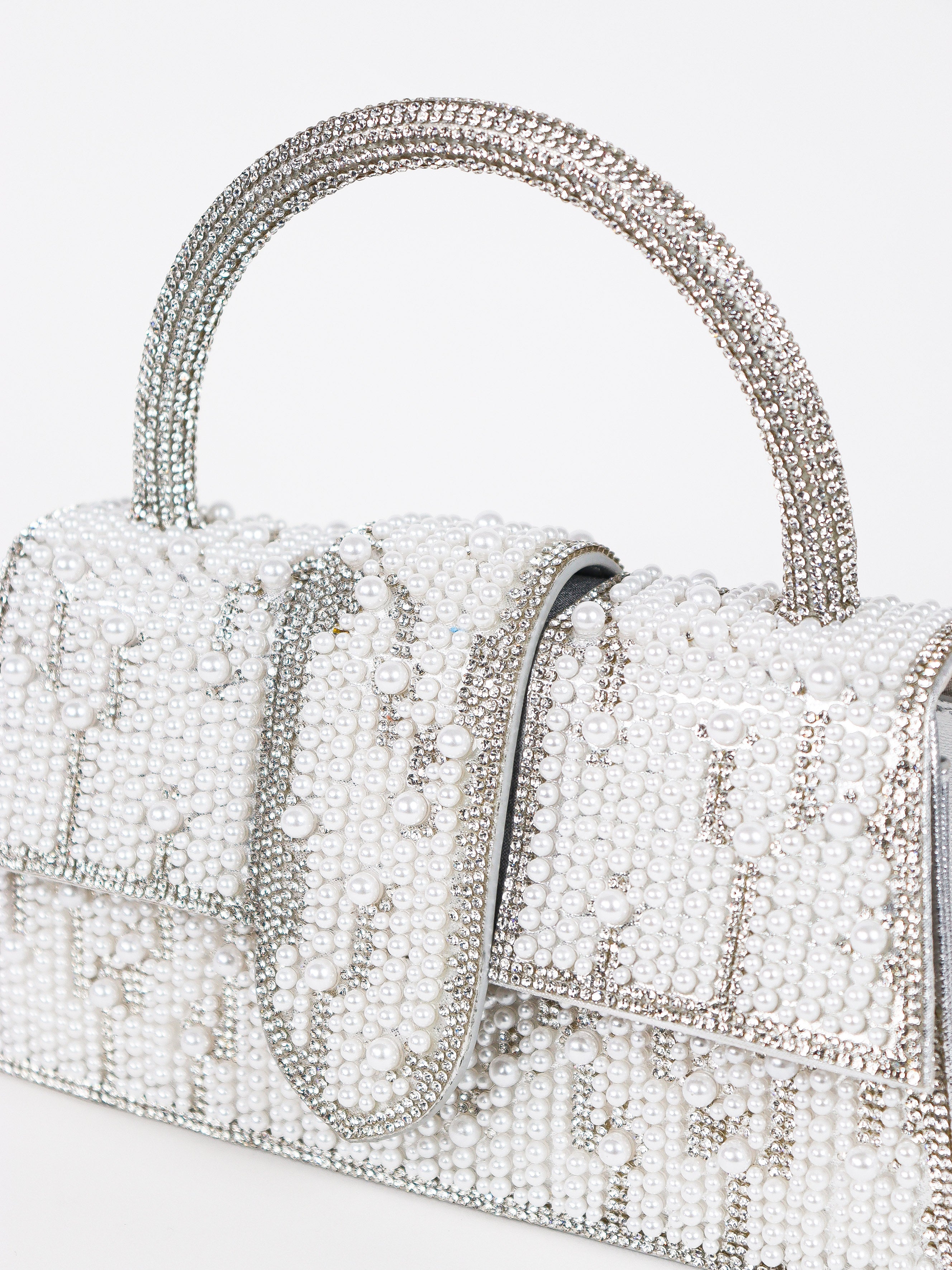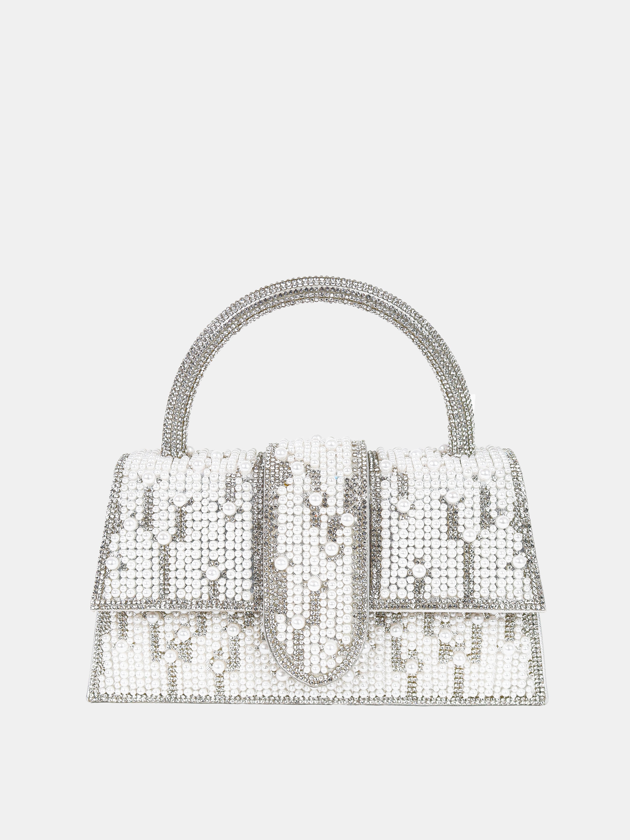 Turn heads with the Lumière Pearl Top Handle Bag, a dazzling accessory perfect for evening events, weddings, and special occasions. Featuring a full rhinestone-embellished exterior, this glamorous bag adds sparkle to any outfit. Compact yet spacious enough for your essentials, the Romie bag comes with a detachable chain strap for versatile styling.
