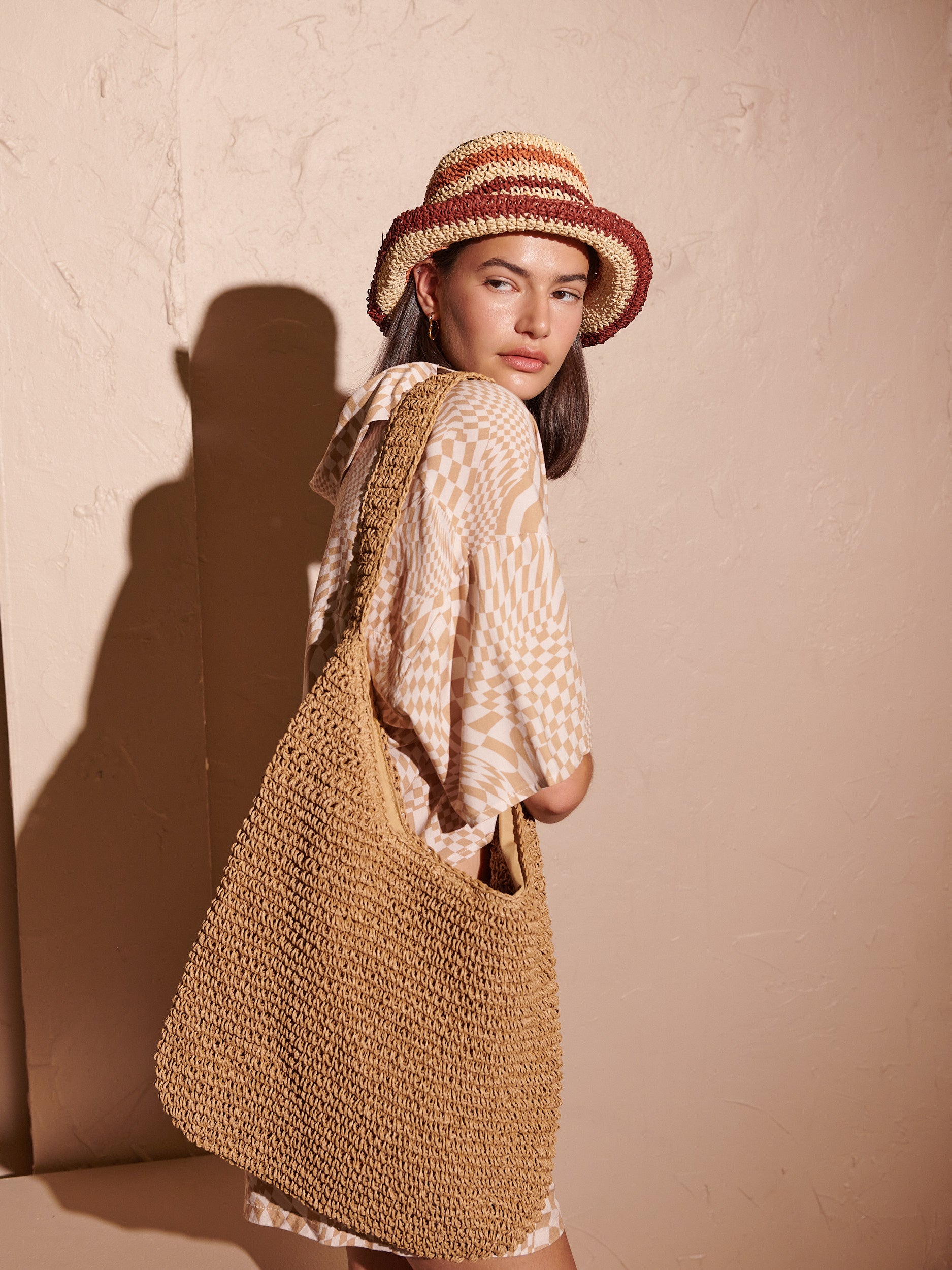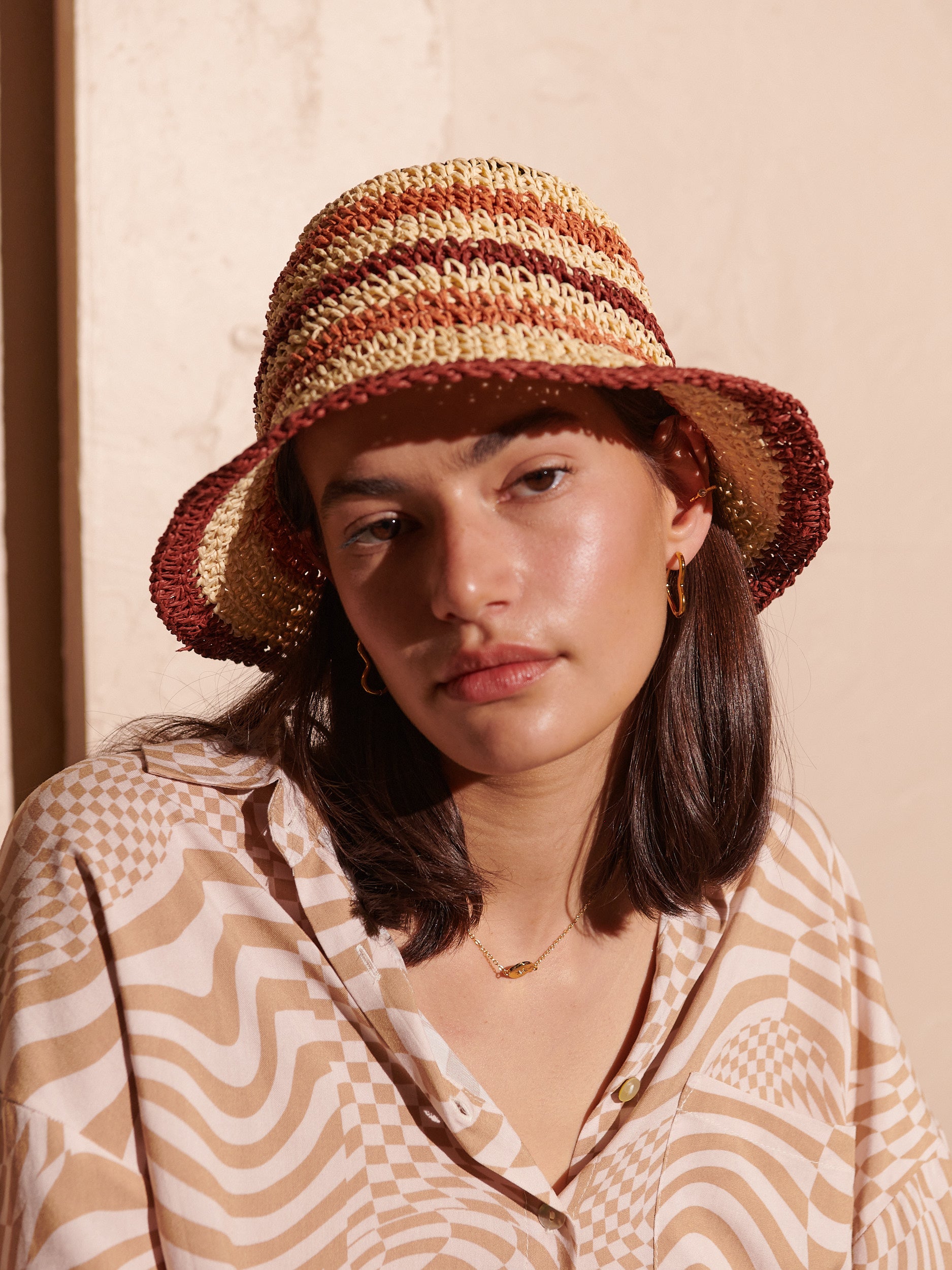 Our summer essential straw bucket hat, featuring bold stripes, will get heads spinning and set you apart from the rest. Put a little sunshine in your wardrobe with the Alana Striped Straw Bucket Hat!