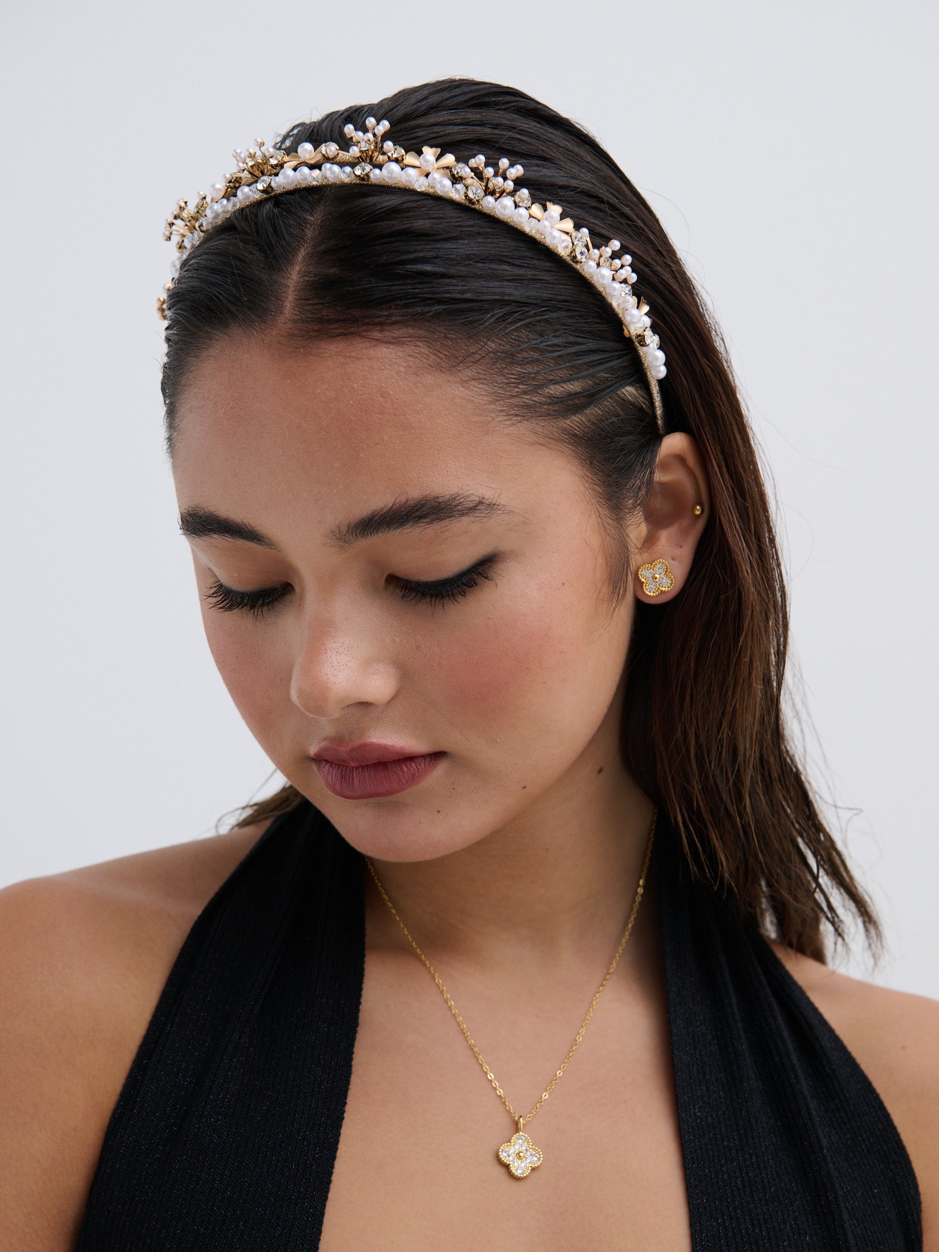 Dress to impress with the Double Pearl Floral Statement Headband, an exquisite accessory crafted with mixture of crystal and shimmering pearl beads craftmanship. Transform any look with that classic, timeless, and sophisticated touch.