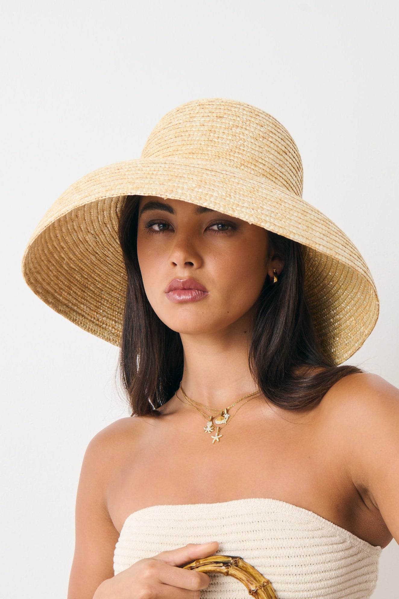 Enhance your style with the Wide Brim Straw Bucket Hat, skillfully crafted from natural straw to create a flattering silhouette. This timeless piece brings a touch of sophistication, making it ideal for a look that’s both refined and effortlessly chic.