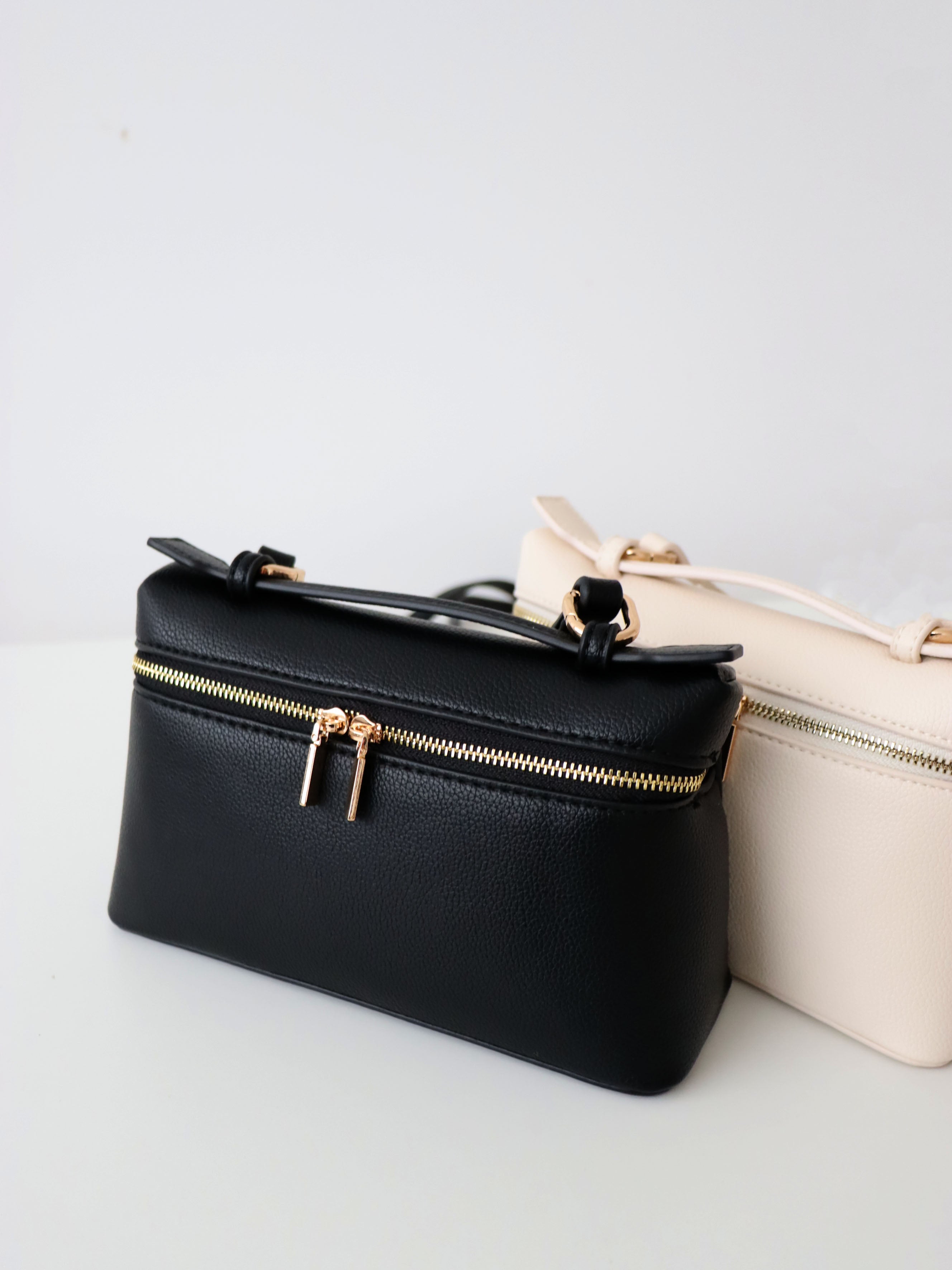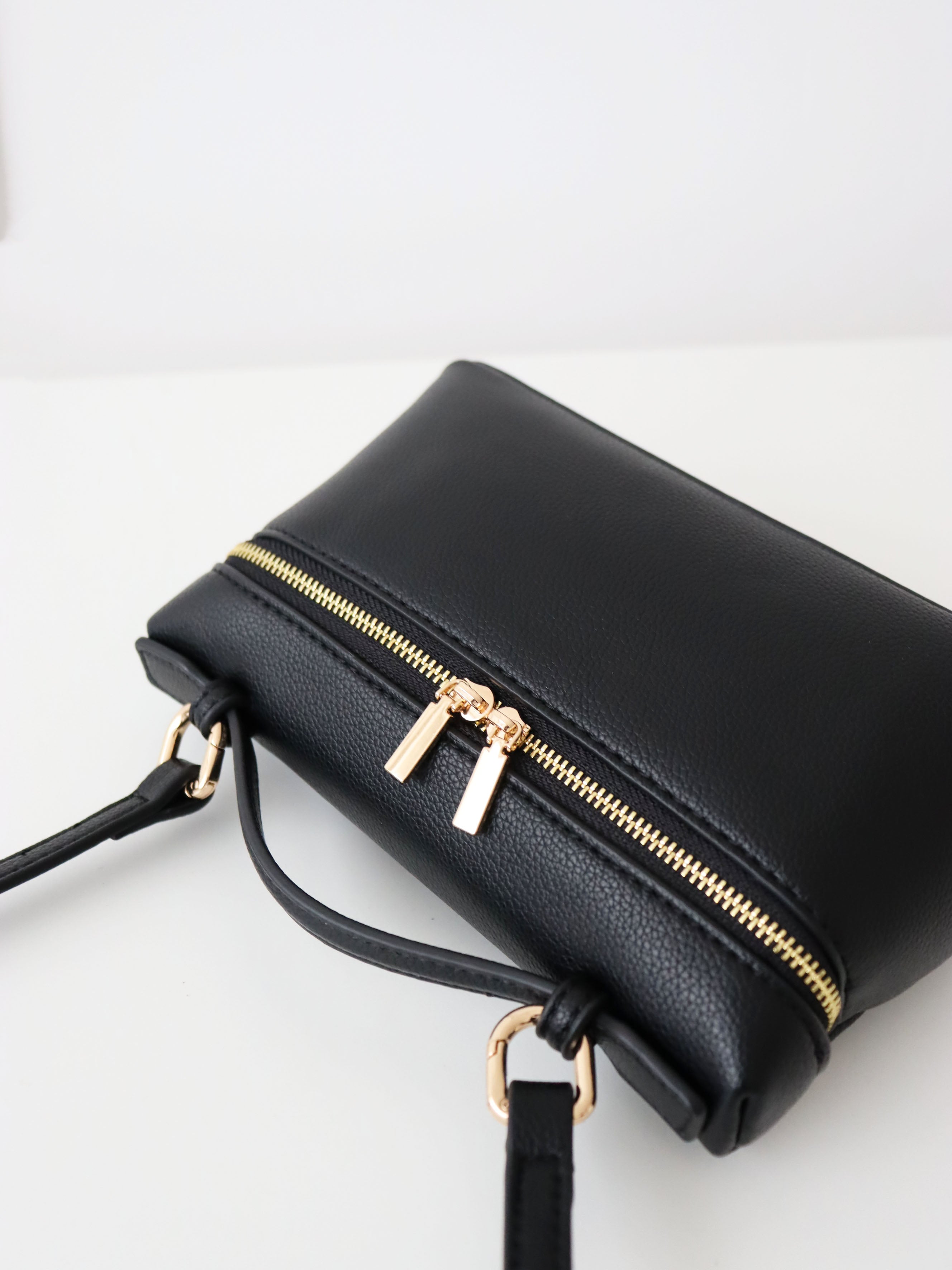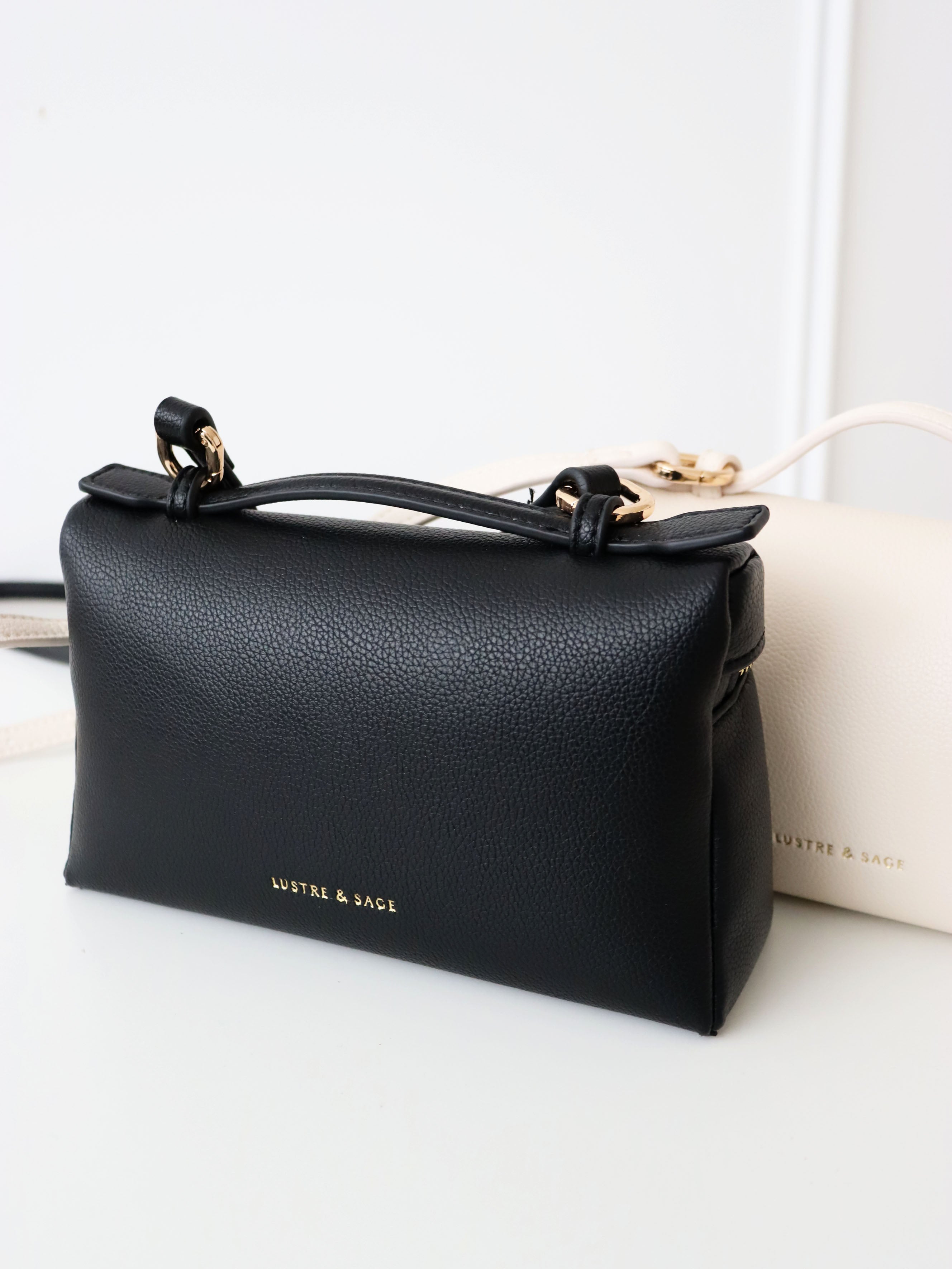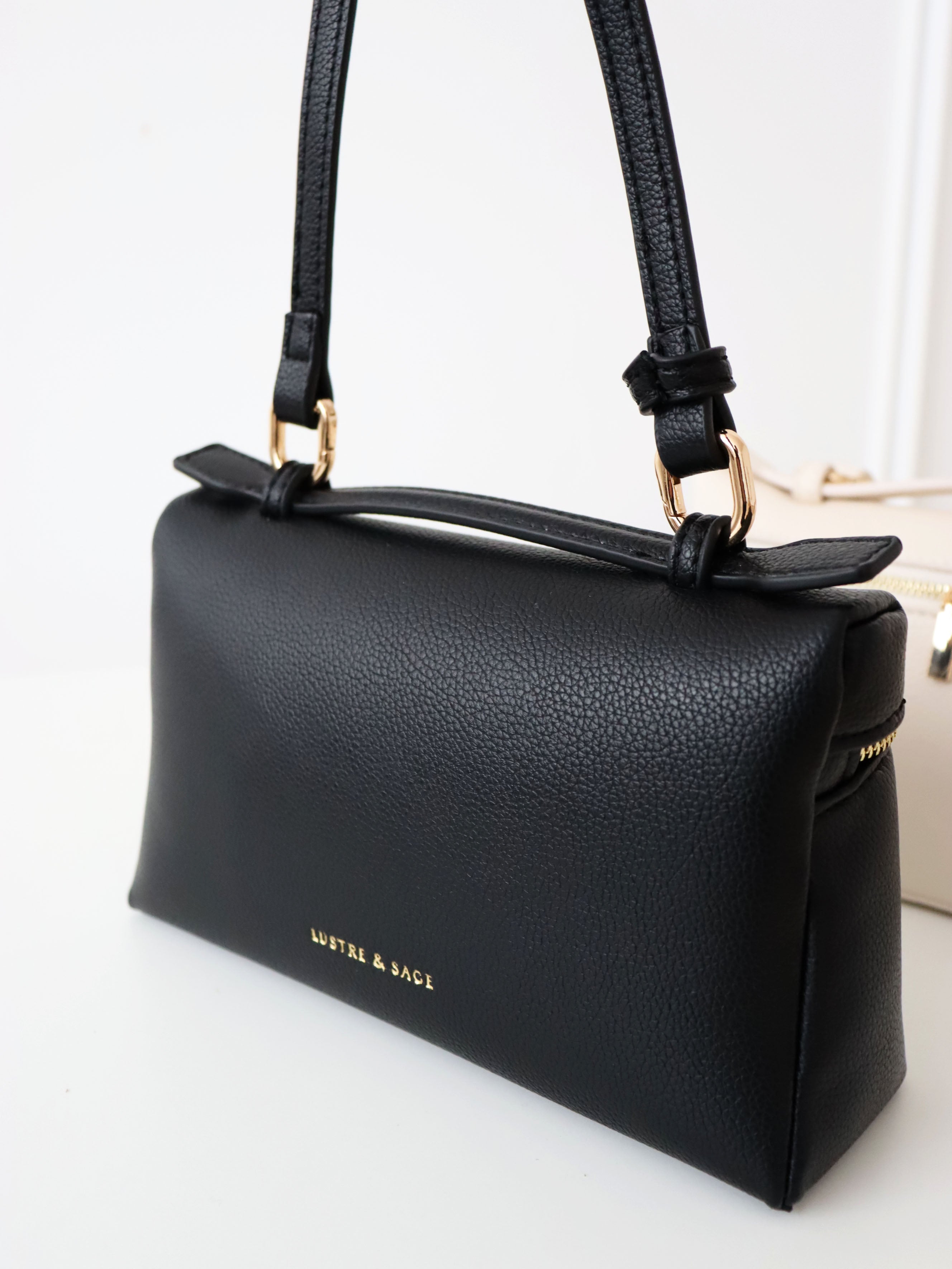 Elevate your everyday style with the Thalia Top Handle Bag in Black. Crafted from premium vegan leather, this chic handbag features a structured silhouette, elegant gold tone hardware, and a versatile top handle design. Perfect for day to night wear, the Thalia Bag adds a touch of timeless sophistication to any outfit.