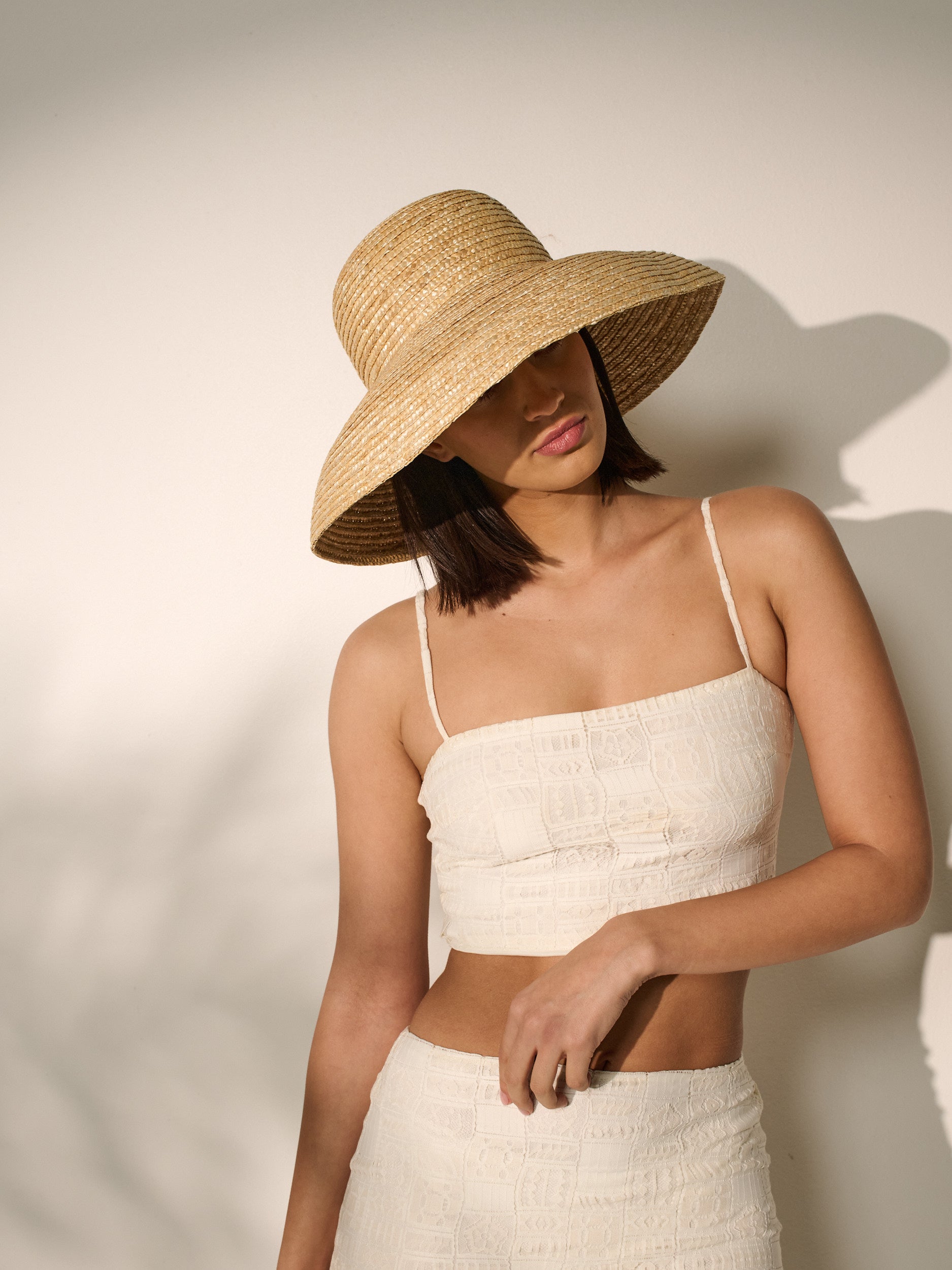 Enhance your style with the Wide Brim Straw Bucket Hat, skillfully crafted from natural straw to create a flattering silhouette. This timeless piece brings a touch of sophistication, making it ideal for a look that’s both refined and effortlessly chic.