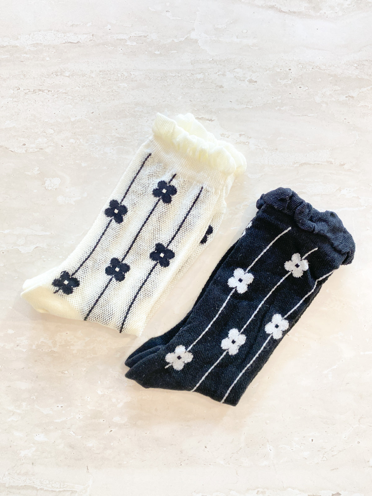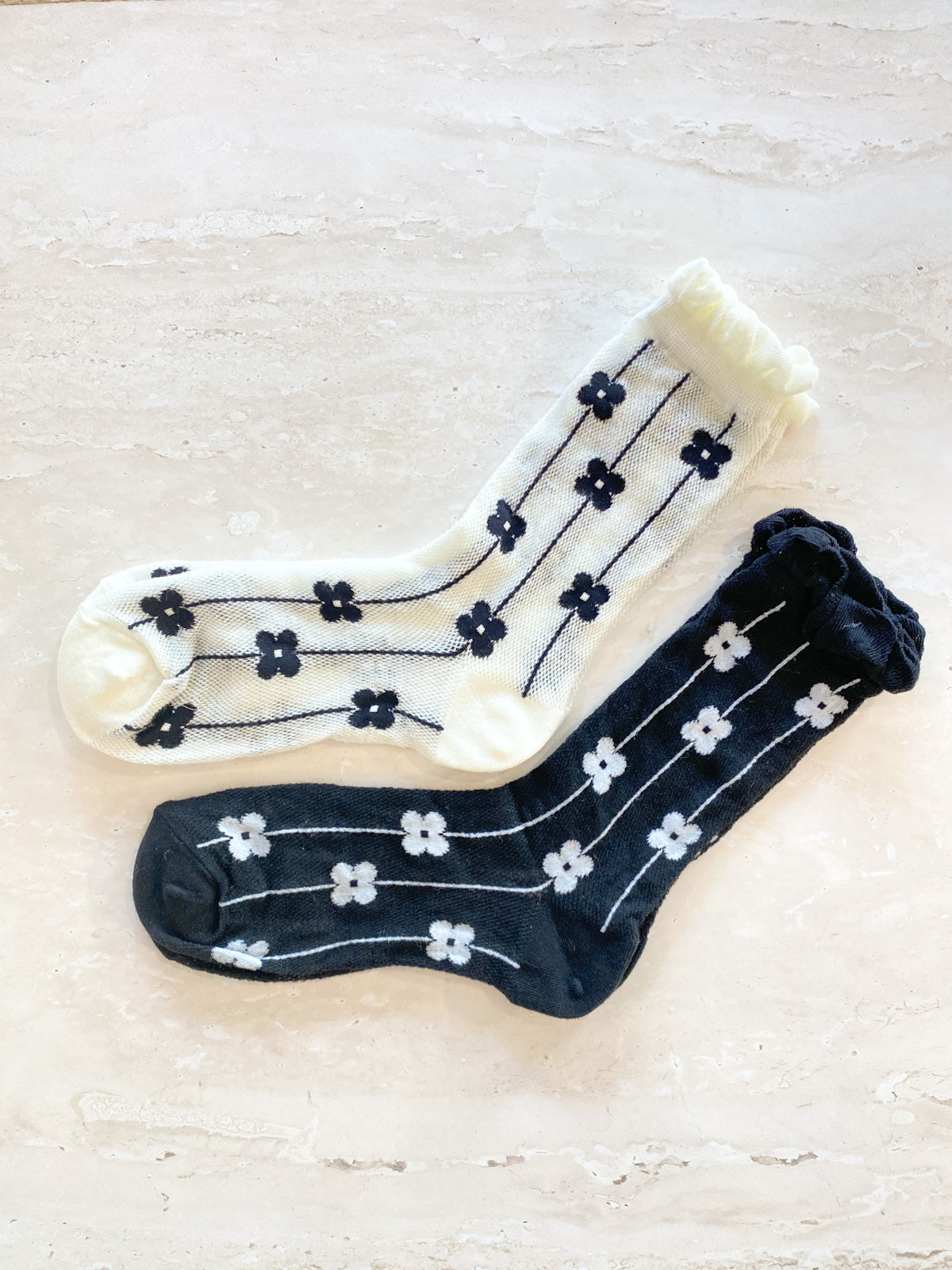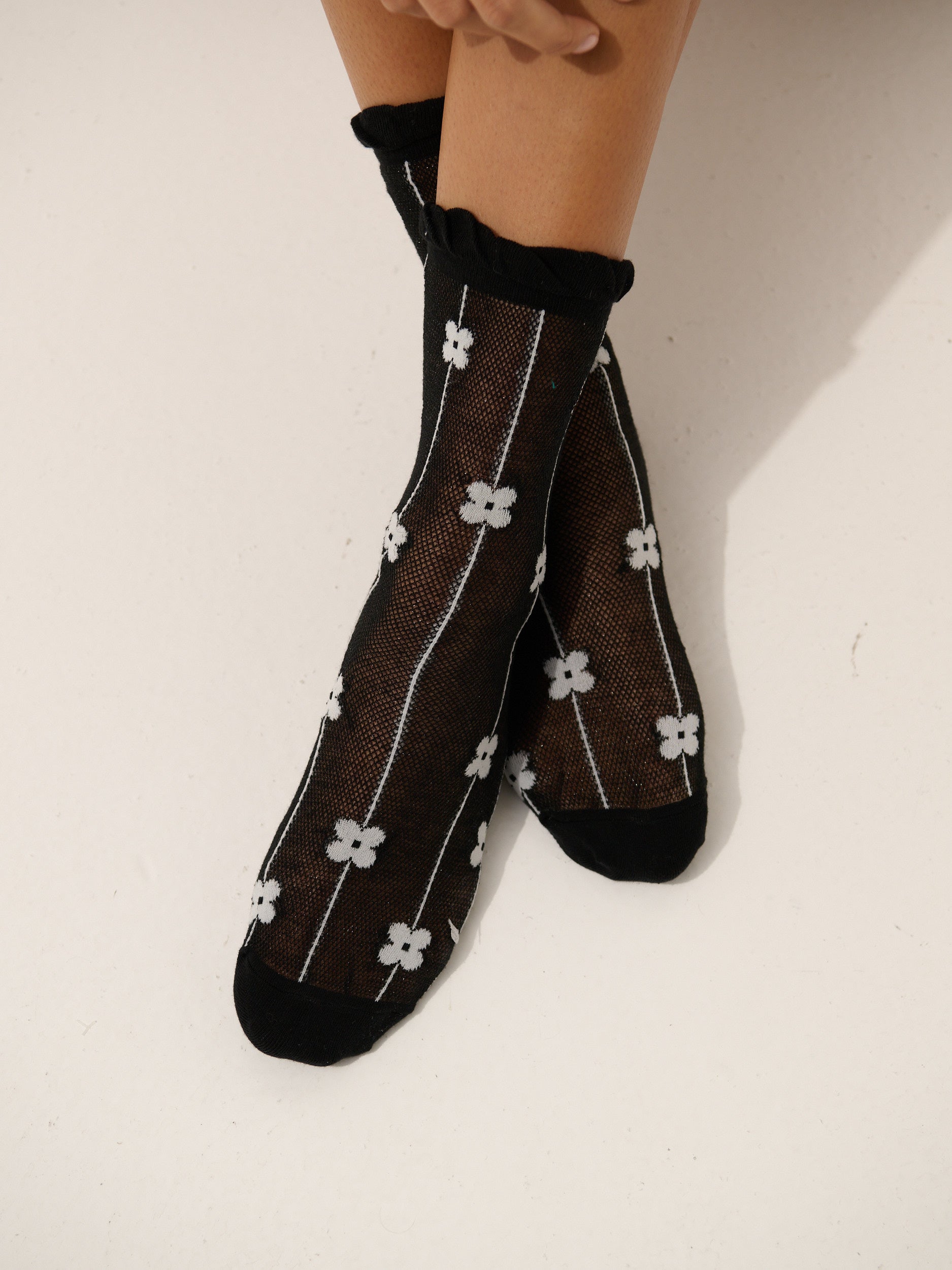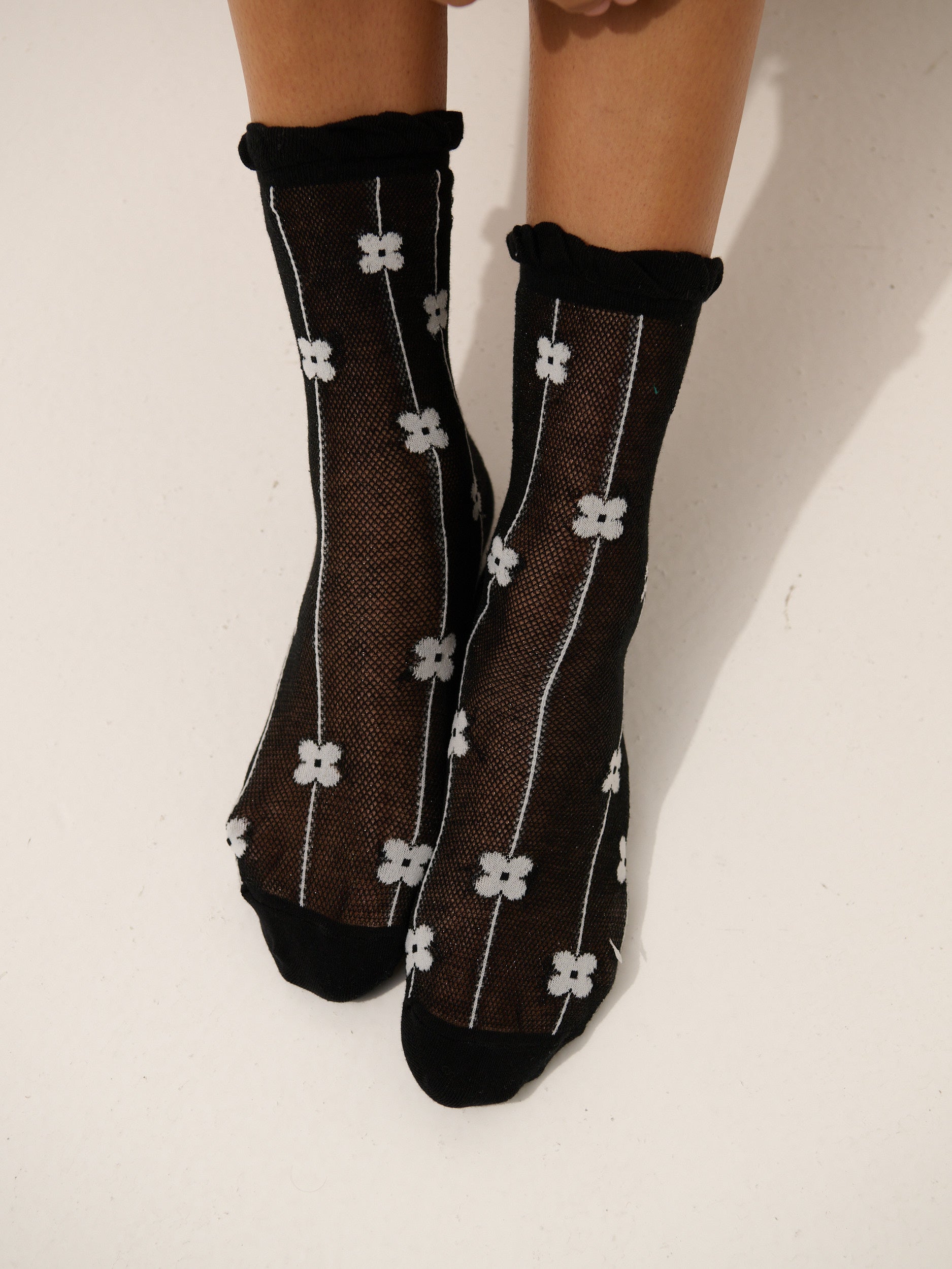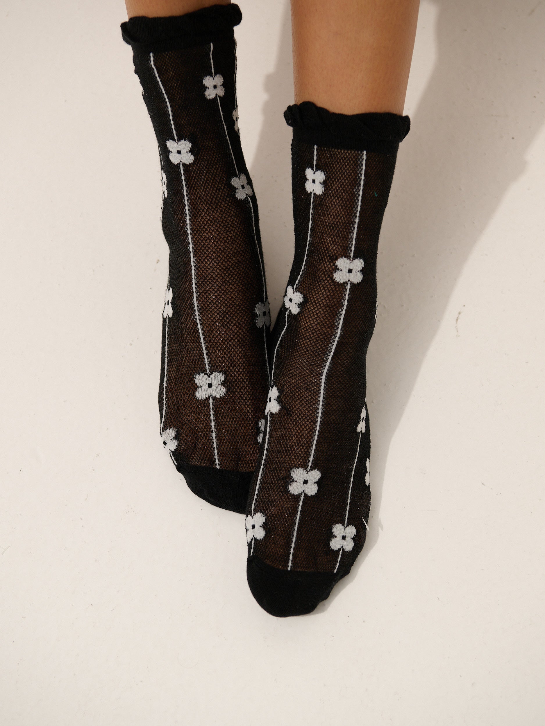 Featuring lightweight daisy printed mesh socks with frill on ankle.