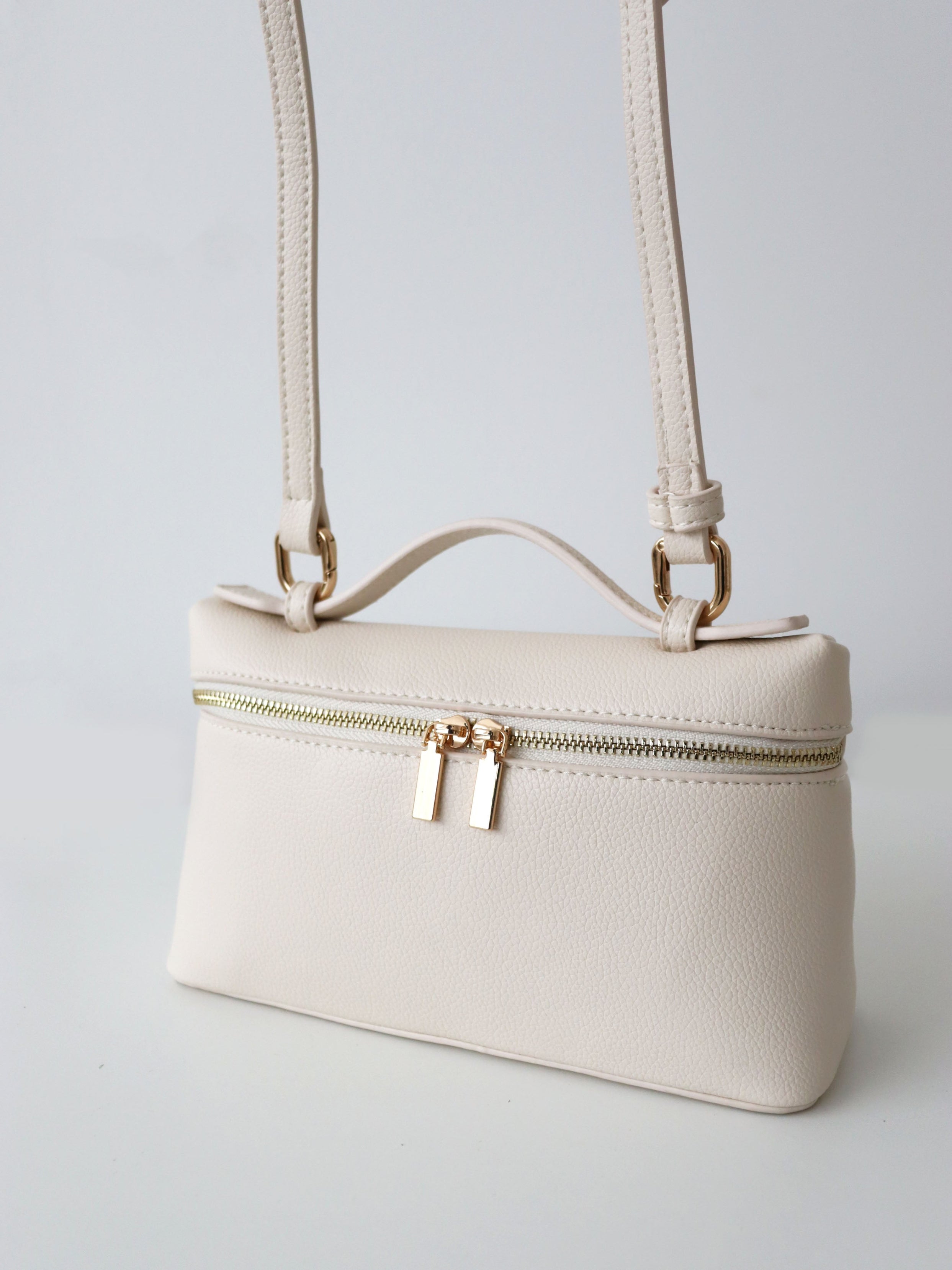 Elevate your everyday style with the Thalia Top Handle Bag in Cream. Crafted from premium vegan leather, this chic handbag features a structured silhouette, elegant gold tone hardware, and a versatile top handle design. Perfect for day to night wear, the Thalia Bag adds a touch of timeless sophistication to any outfit.